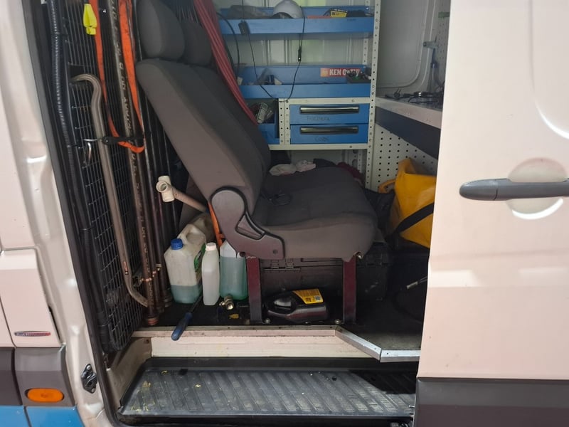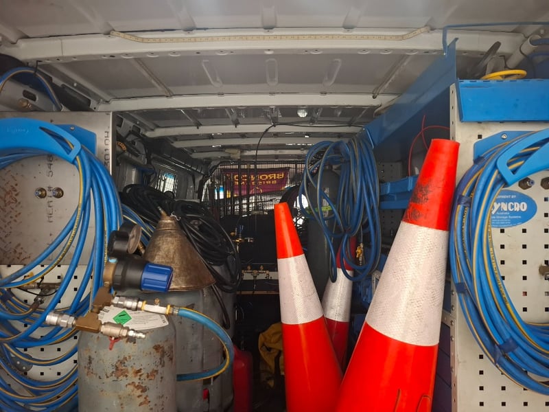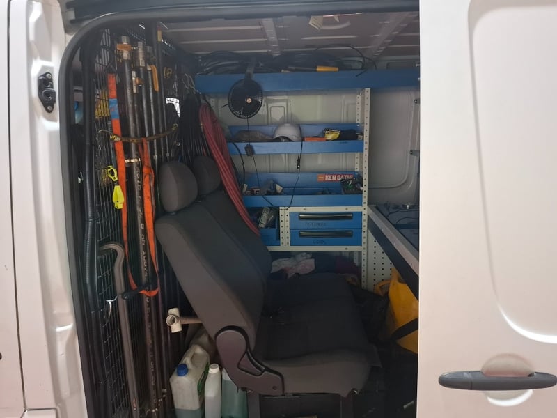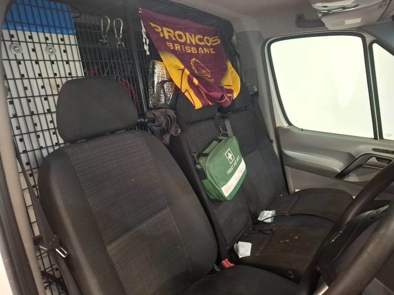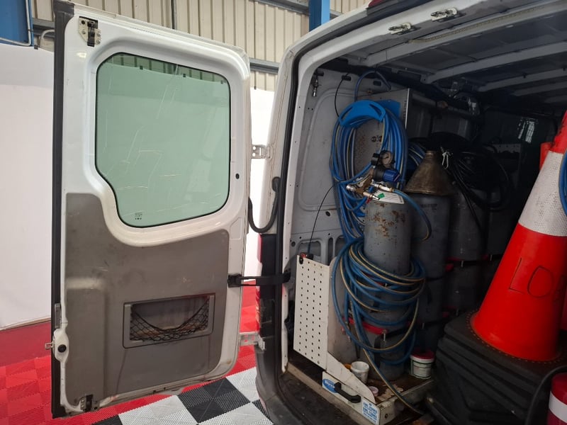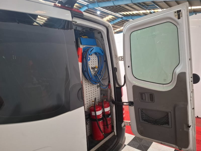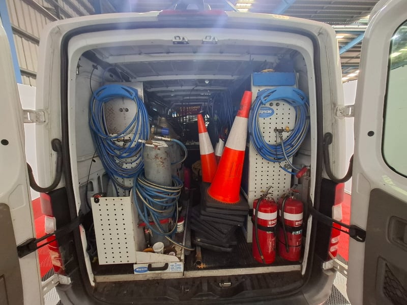 Multi-function steering wheel, manual handbrake, cabin cage, storage compartments, sunglasses holder, map lights, Bluetooth, electric side mirrors, First aid kit in cabin, cargo mounted twin seats, fully fitted out for commercial use with tools, fire extinguishers, road cones, gas bottles hoses and lines, appear the some lines have been plumbed in to the vehicle. Some minor damage to exterior, including scuffs scratches and dents, stains and tear on seats.
