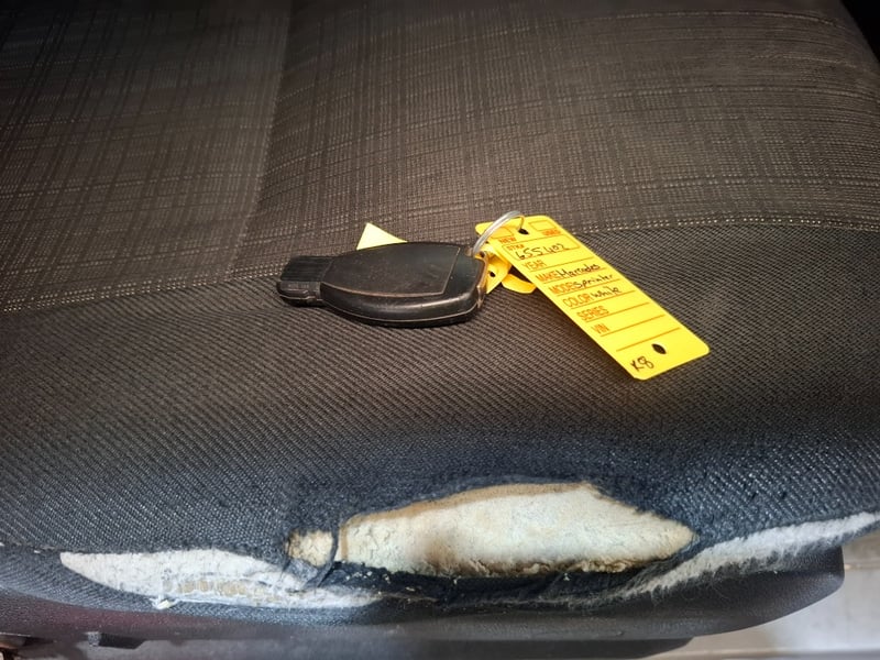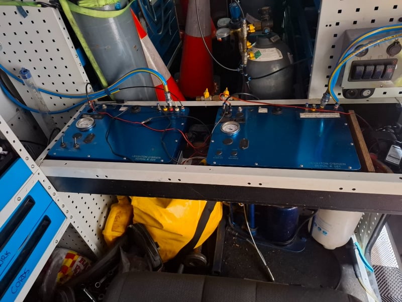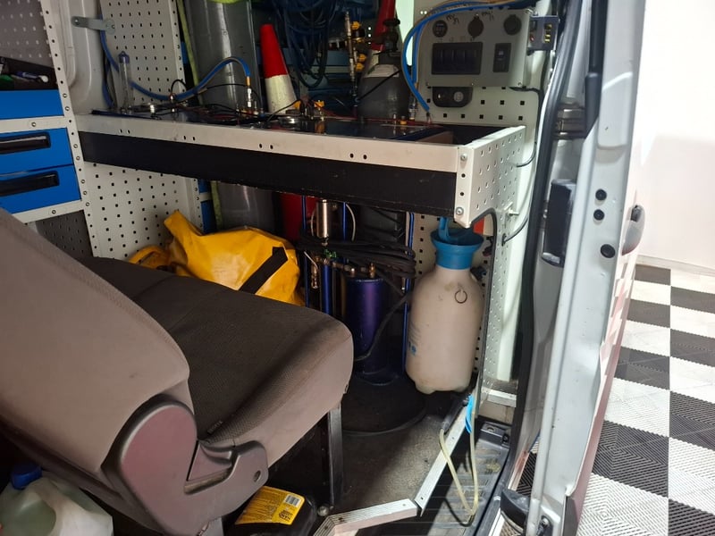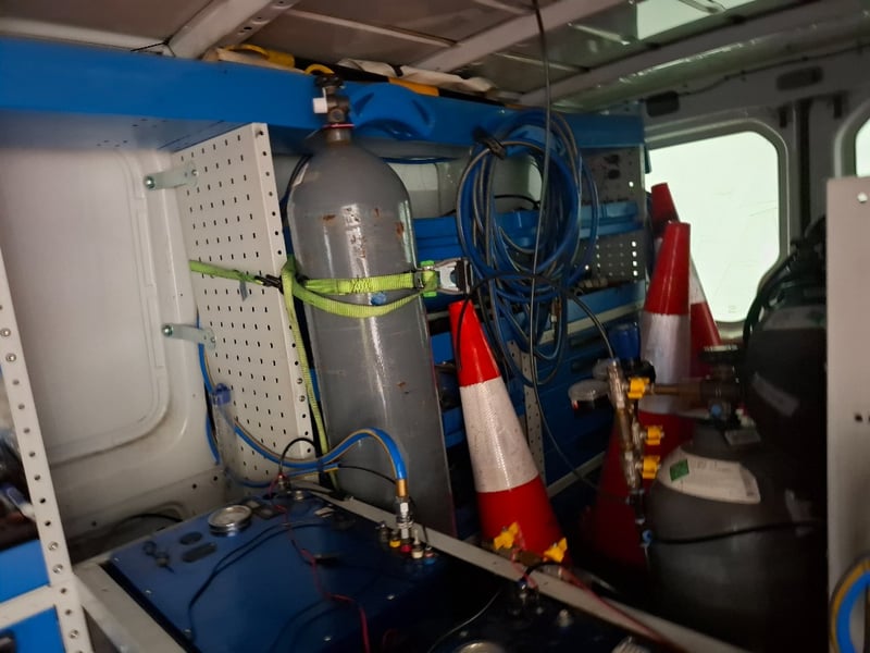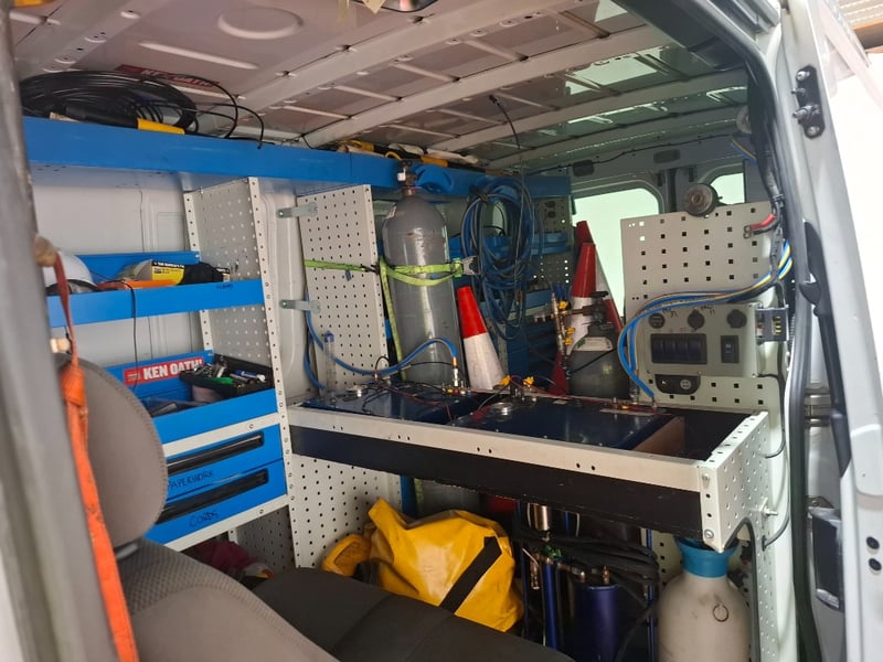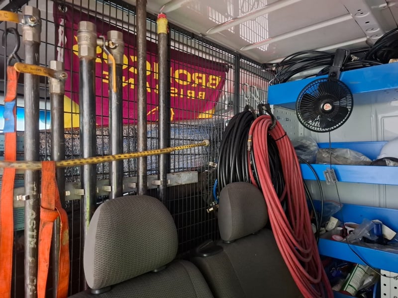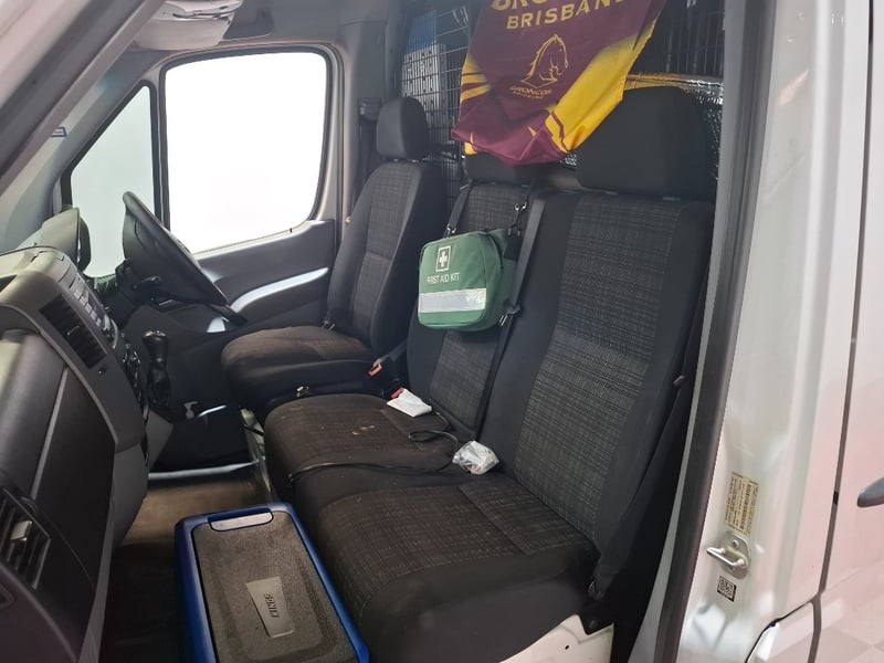Multi-function steering wheel, manual handbrake, cabin cage, storage compartments, sunglasses holder, map lights, Bluetooth, electric side mirrors, First aid kit in cabin, cargo mounted twin seats, fully fitted out for commercial use with tools, fire extinguishers, road cones, gas bottles hoses and lines, appear the some lines have been plumbed in to the vehicle. Some minor damage to exterior, including scuffs scratches and dents, stains and tear on seats.