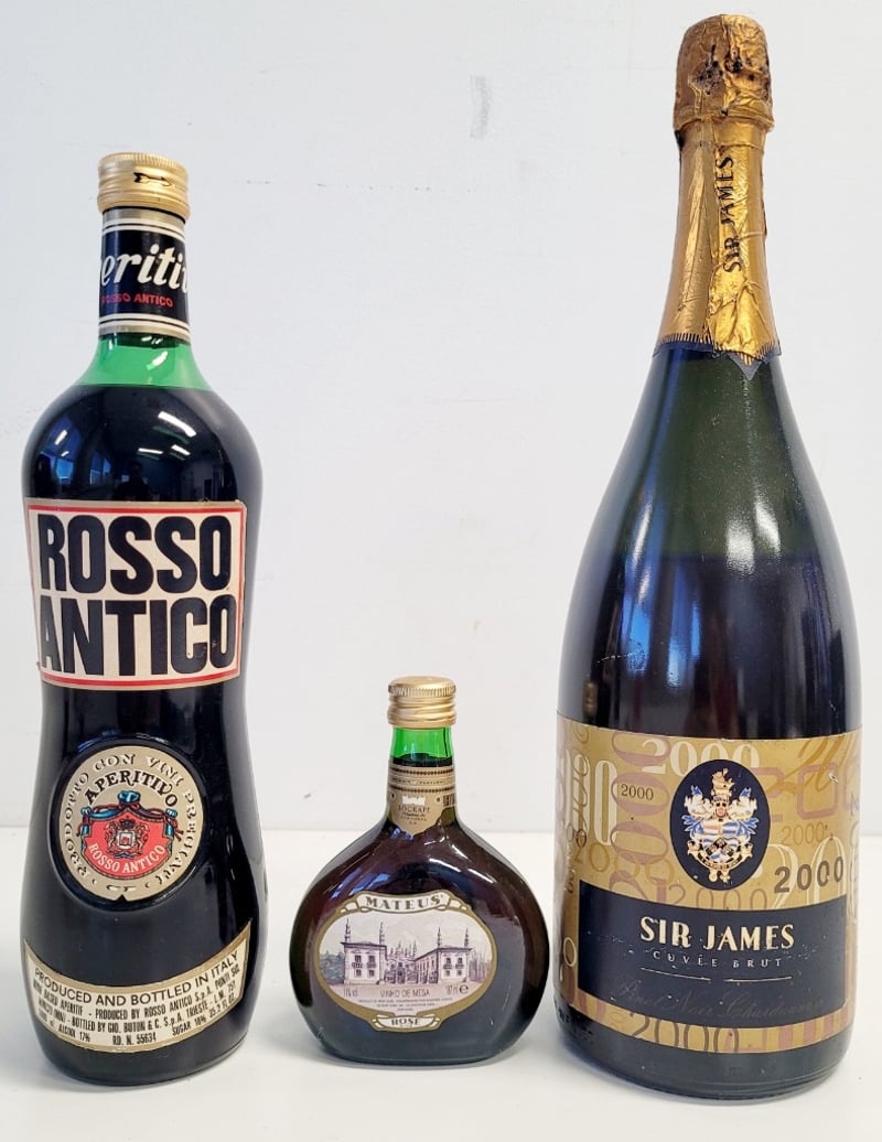 3X VINTAGE COLLECTION OF ALCOHOL BOTTLES Sir James 2000 Curvee Brut Mateus Vinho De Mesa Rose Wine Ross Antico Prodotto Con Vini Pregiati 488562+3