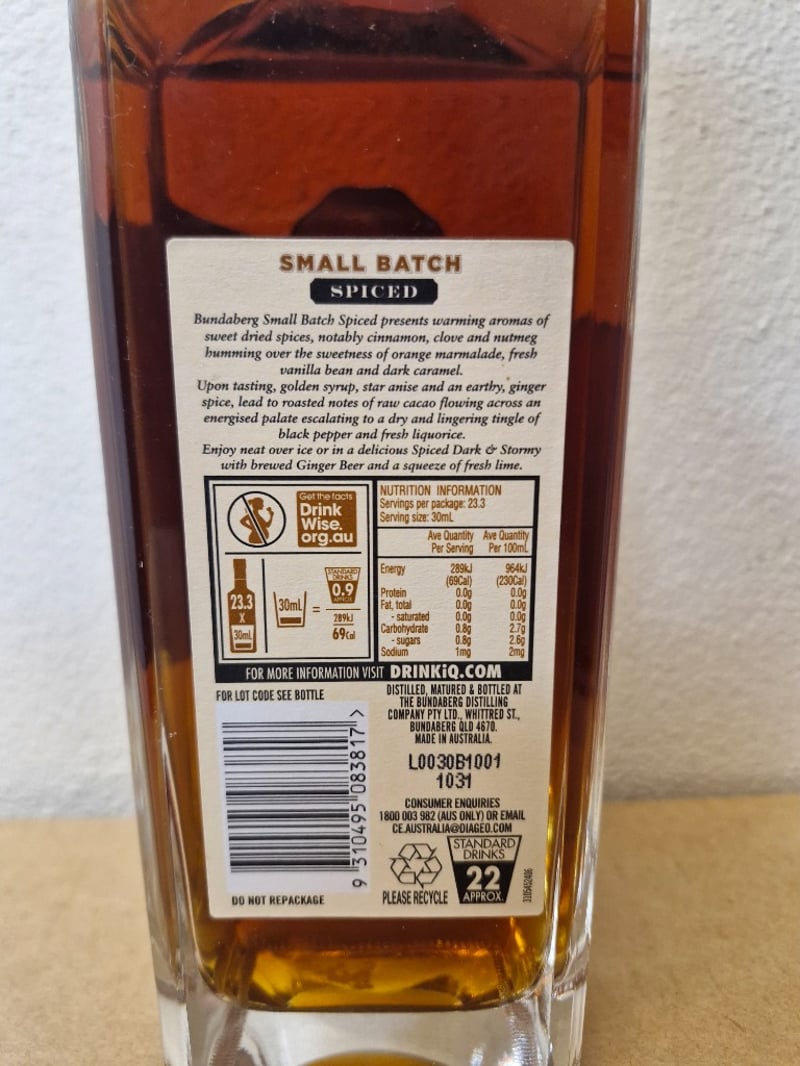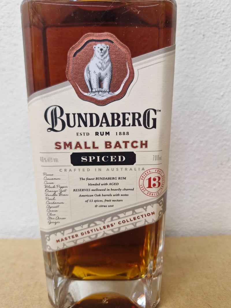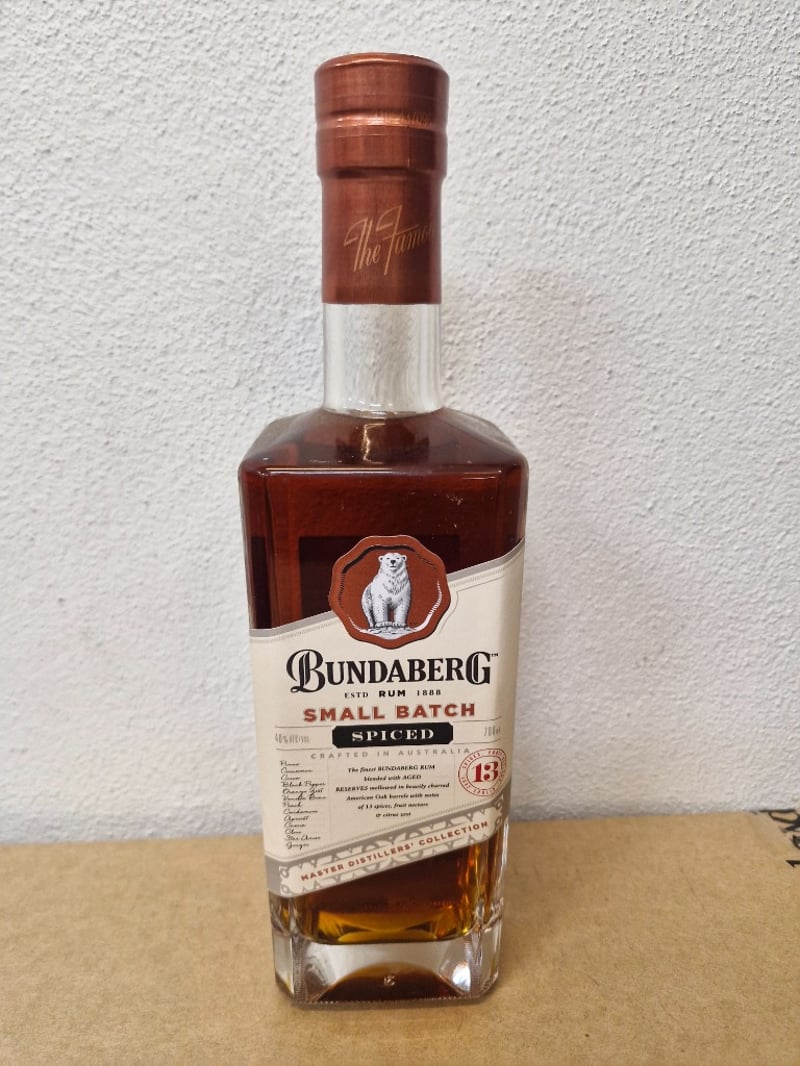 Bundaberg Small Batch Spiced Rum, 700ml bottle, 40% ABV. Australian-crafted rum from the Master Distillers' Collection, aged in heavily charred American Oak barrels. Features warming aromas of sweet dried spices including cinnamon, clove, and nutmeg, complemented by orange marmalade, fresh vanilla bean, and dark caramel notes. Tasting profile reveals golden syrup and star anise with earthy ginger spice, leading to roasted raw cacao and black pepper with lingering dry finish.