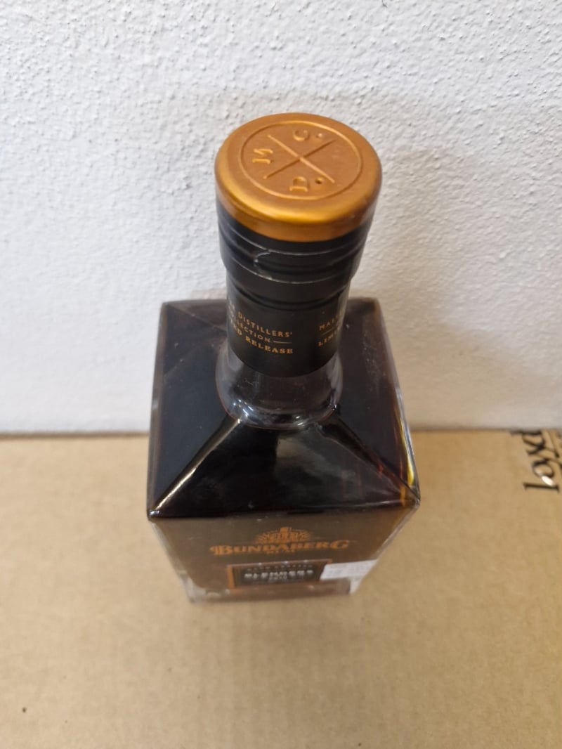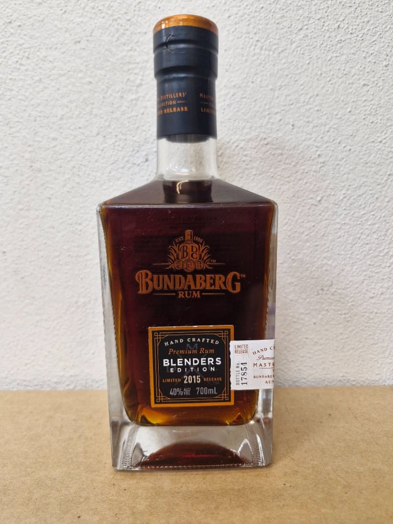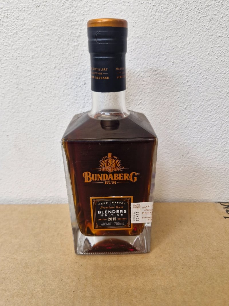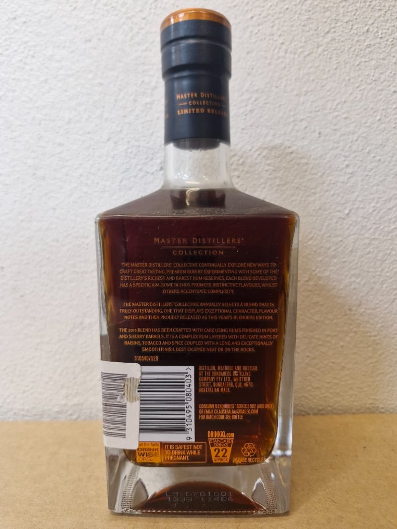 Bundaberg Rum Master Distillers' Collection Limited Release bottle. Lot includes a bottle of Bundaberg Blenders Edition 2015 (700mL, 40% ABV) - hand-crafted premium rum featuring port and sherry barrel finishing with notes of raisins, tobacco and spice. Also includes Master Distillers' Collection Limited Release bottle with complex layering of delicate hints of raisins, tobacco and spice. All bottles feature distinctive square glass bodies with gold foil capsules and black labels. Bottles show minor wear consistent with age and storage. Australian-made spirits from the Bundaberg Distillery, Queensland.