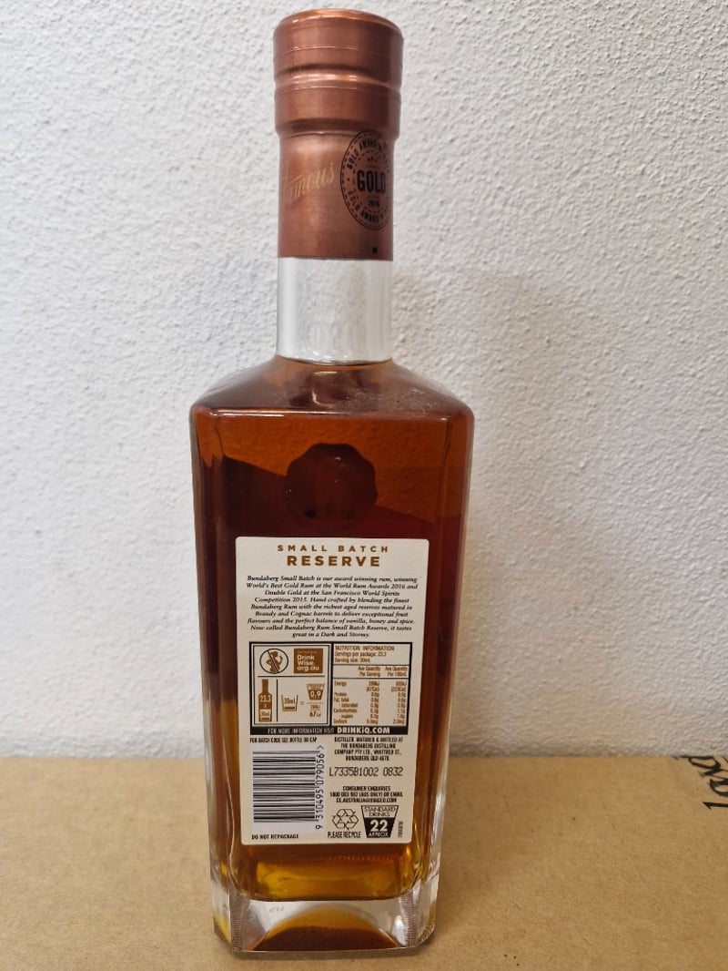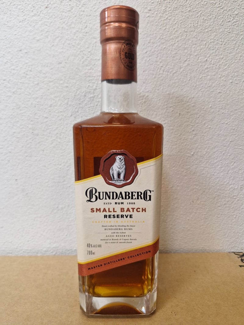 Bundaberg Small Batch Reserve rum, 700ml bottle at 40% alcohol by volume. Part of the Master Distillers' Collection, this premium Australian rum is hand-crafted by blending the finest Bundaberg rums with the richest aged reserves. The bottle features a distinctive copper capsule and seal with embossed branding. Label indicates award-winning credentials and tasting notes.