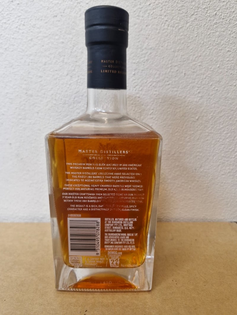 Bundaberg Rum Master Distillers' Collection Limited Release bottle. This premium rum represents a curated selection from the Master Distillers' Collective, featuring a blend matured in 280 American whiskey barrels from Kentucky, United States. The expression showcases hand-selected barrels aged to achieve a rich, complex character with a distinctly smooth American whiskey influence. The bottle displays the characteristic Bundaberg square-based design with embossed detailing. Label indicates Master Distillers' Collection designation with limited release status. Capsule features crossed "DMDC" insignia. Bottle contains 700ml at 40.6% ABV. Includes original hand-crafted production number (No. 73022) visible on label. The rum exhibits a deep amber colour indicative of extended barrel maturation. This is a collectible release from Australia's renowned Bundaberg Distillery, representing their premium portfolio offering.