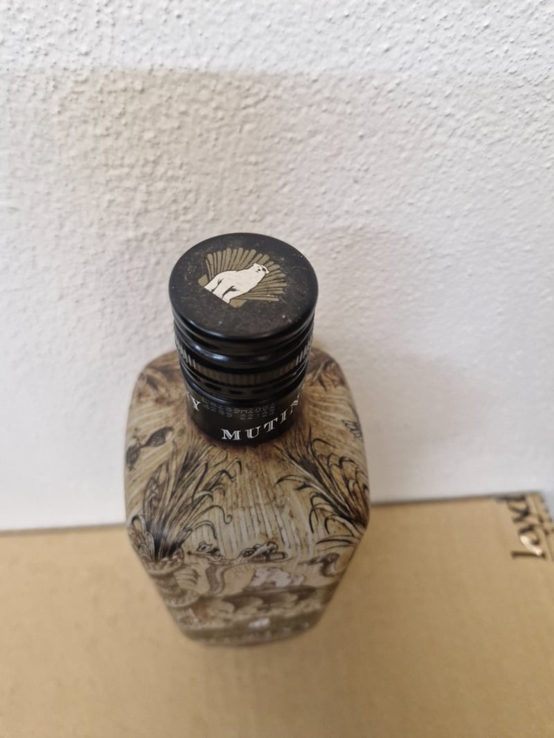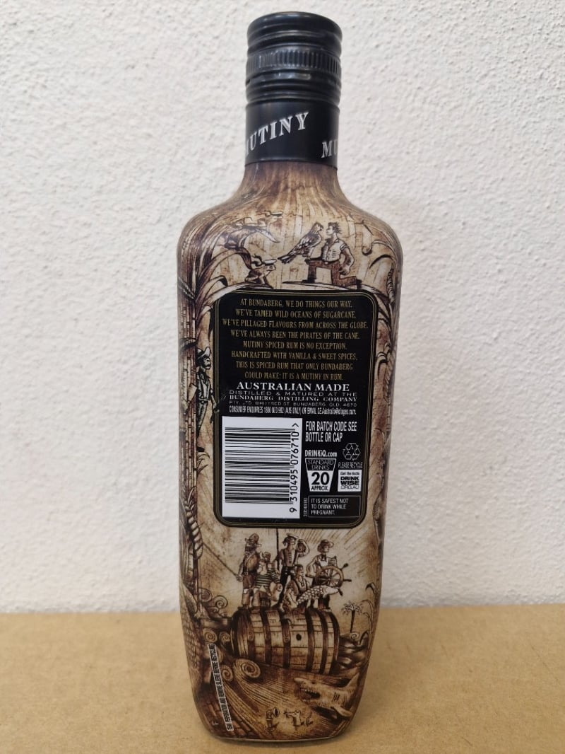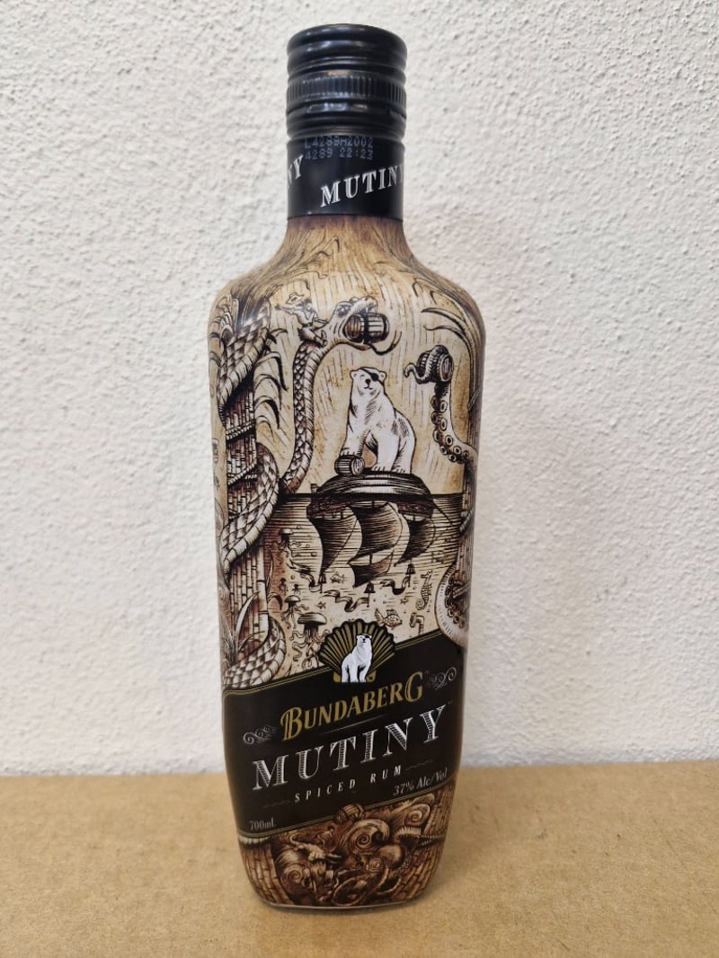 Bundaberg Mutiny Spiced Rum, 37% ABV, 700ml bottle. Australian-made spiced rum from Bundaberg Distilling Company featuring distinctive hand-engraved label artwork depicting pirate and nautical scenes. The bottle showcases intricate decorative engravings with period maritime imagery throughout. Handcrafted with vanilla and sweet spices, this spiced rum represents the brand's signature offering. Bottle includes batch code reference visible on back label. Sealed with black screw cap featuring embossed kangaroo motif. The label narrative describes the rum's heritage and flavour profile.