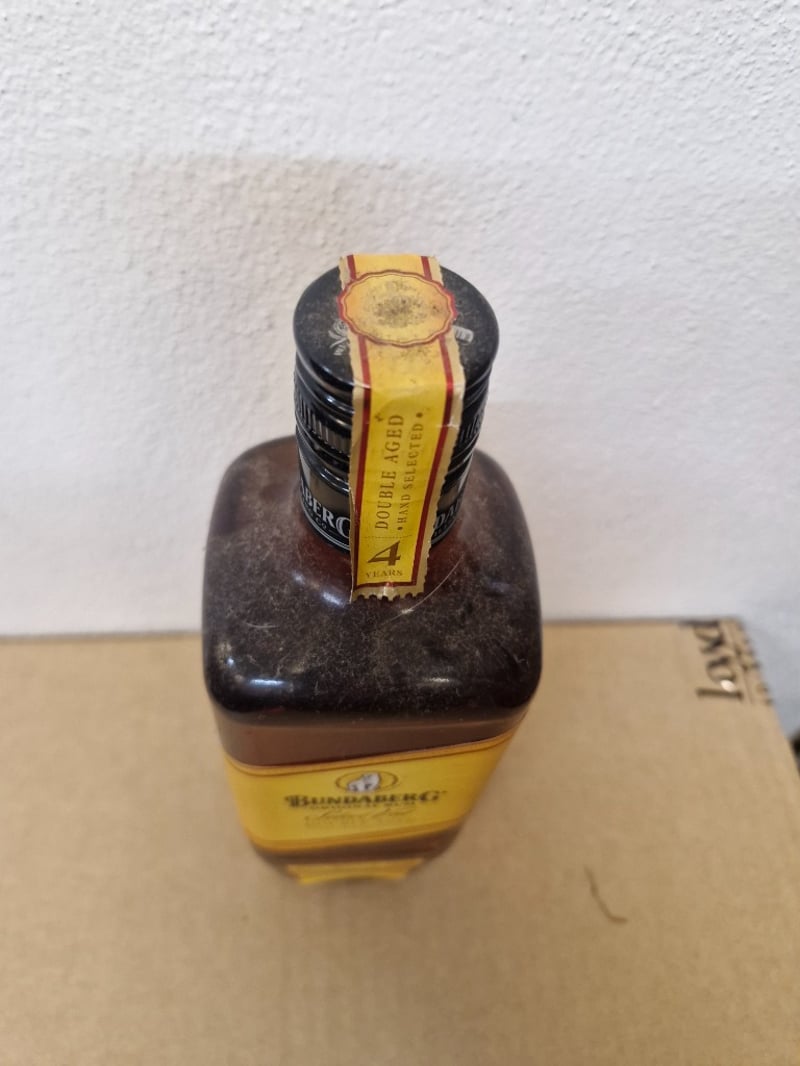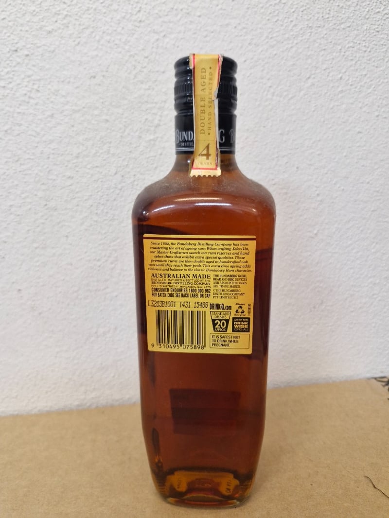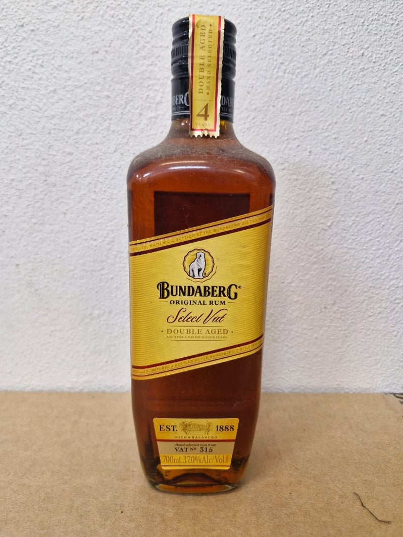 Bundaberg Select Vat Double Aged Original Rum, 700ml bottle at 37.0% alcohol by volume. Australian-made rum produced by the Bundaberg Distilling Company, established 1888. The bottle features the distinctive yellow and black label with gold ribbon accent and "Double Aged" designation with "4 Years" maturation period clearly marked. VAT No. 315 indicated on label. Bottle shows signs of age and storage with visible patina on the glass surface. Includes original seal and cap intact. A premium Australian rum offering from one of the country's oldest and most respected distilleries.
