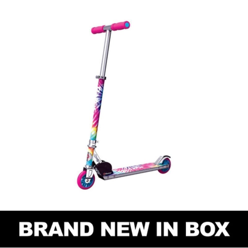 RRP $90 Razor A Special Edition - Tie Dye Super Special The Razor A Special Edition kick scooters with their unique graphics put a new twist on our all-time iconic ride. Ready to go right out of the box, the lightweight A Special Edition kick scooters match updated styling with an aluminium deck, our original folding mechanism, rear fender brake, and urethane wheels to make it the perfect ride for kids on-the-go. Ready to Ride Unfold and go – it’s that easy with the Razor A Special Edition kick scooters. With no assembly required, and easy-adjust handlebars to set the perfect ride height, the Razor A Special Edition kick scooters are ready for their first adventure as soon as you are. Reinventing a Classic Our iconic Razor A kick scooter has set the standard for fun since it launched a global phenomenon in 2000. And with all-new Special Edition graphics that add an extra splash of style to our classic design, you can launch the next phenomenon in your neighbourhood. Features - Special Edition graphics feature either a bright colour tie-dye effect. - Top quality aluminium construction that is lightweight yet durable. - Features Razor’s original folding mechanism for quick and easy carry, transport, and storage between rides. - Easy-adjust handlebars can be set to the perfect ride height. - Additional features include rear fender brake and urethane wheels. - No assembly required, ready to ride out of the box. #e2mob