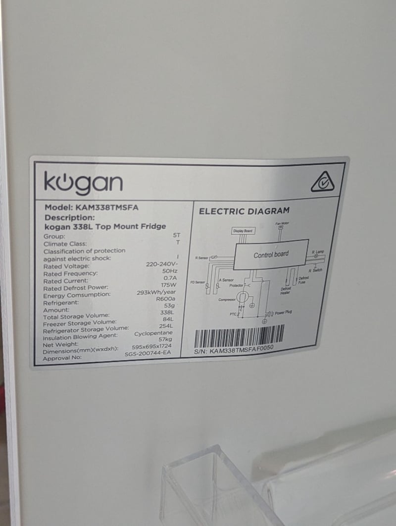 Fridge, Kogan, model: KAM338TMSFADimensions: H 171cm x W 59cm x D 68cm