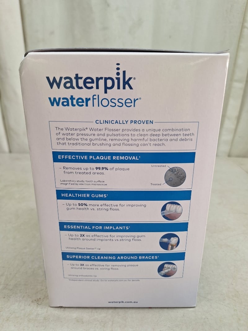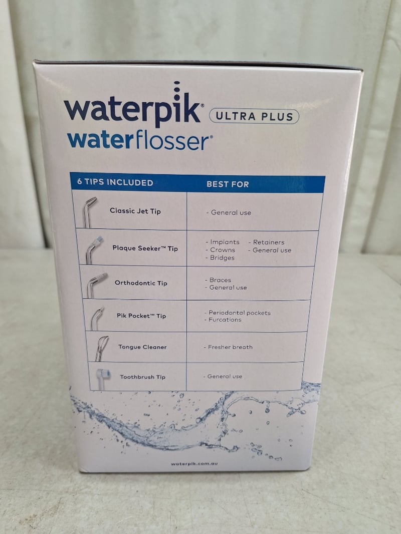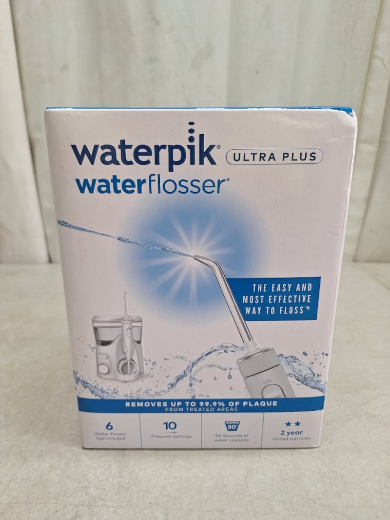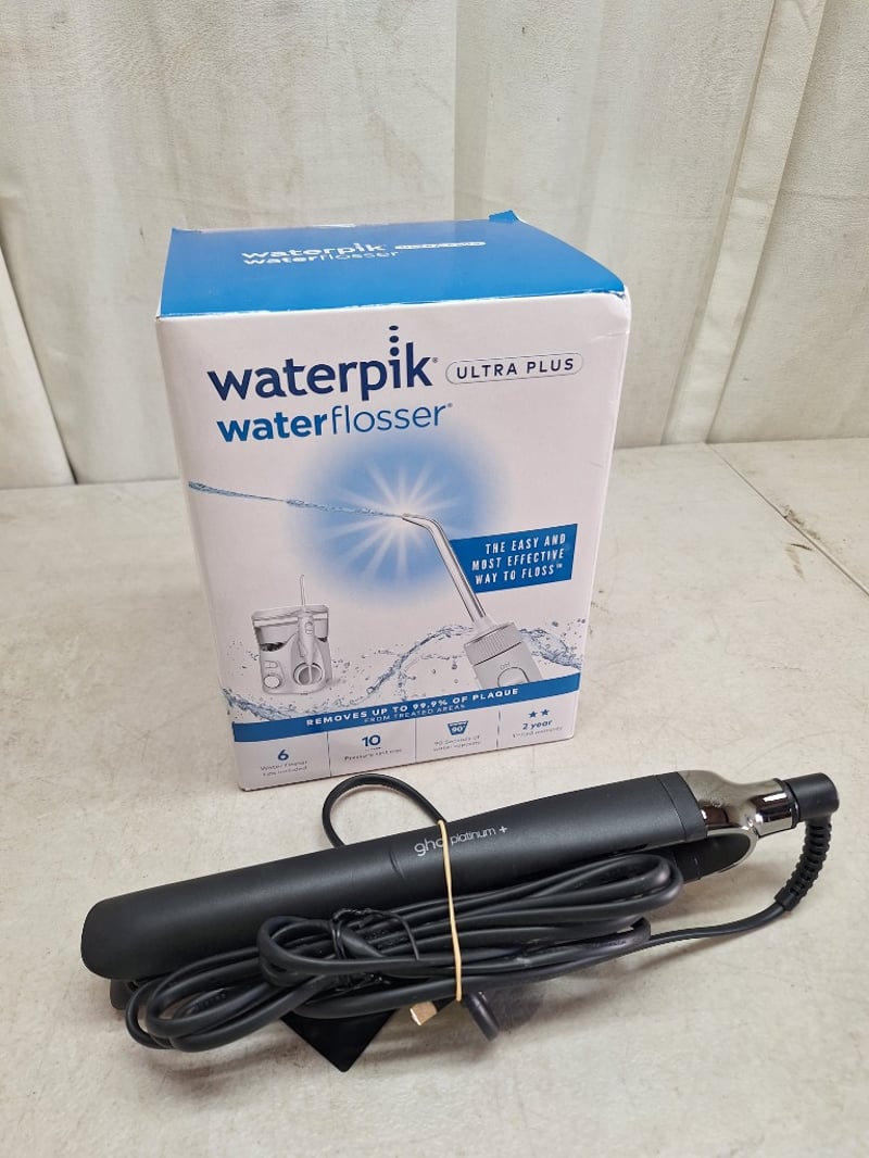 1 x WATERPIK waterflosser, cordless select, model: FW-10A010, RRP $108.89, NEW factory sealed in box, 1 x GHD platinum+ hair straightener, model: S8T262, with charger