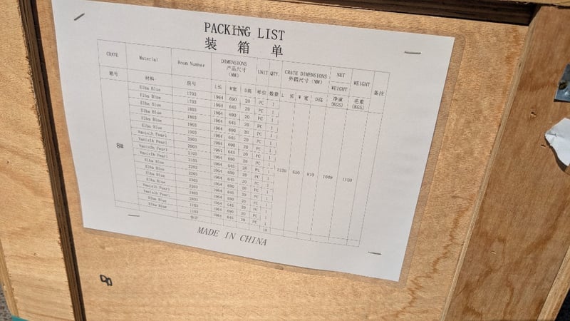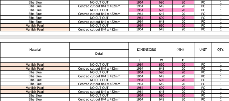 Marble, Manchetti Natural Stone - Elba Blue and Vanilsh Pearl, No Cut-Out and Centred Cut-OutDimensions: 1964mmL x 645-690mmW x 20mmDCentred cut out 844 x 482mmBid per Pc must take 18Pcs