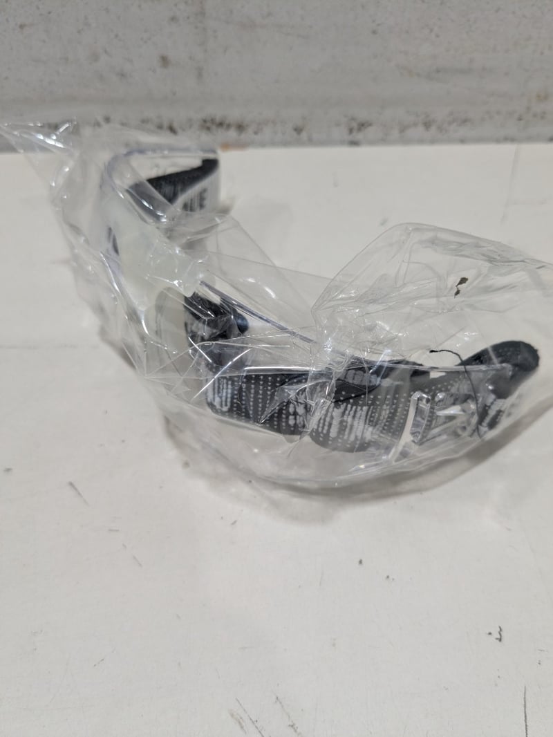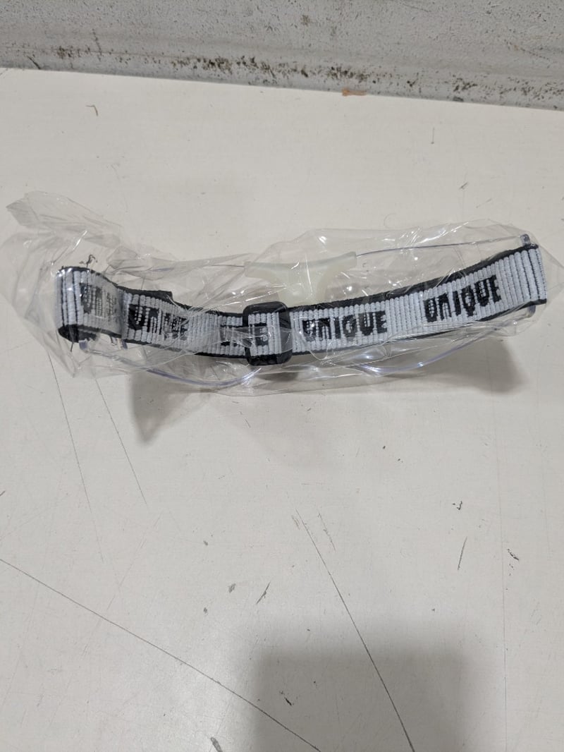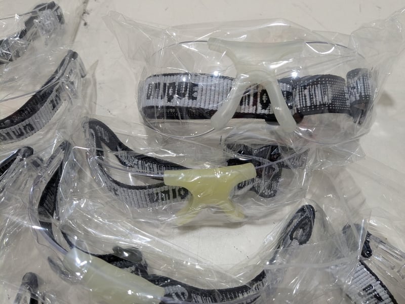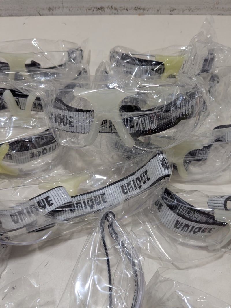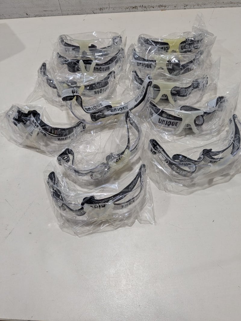 Bulk lot of 12 clear polycarbonate safety spectacles branded "Unique" with adjustable black fabric straps. Each pair features transparent lenses with black temple arms and comfortable nose bridge design. Spectacles arrive individually wrapped in plastic packaging