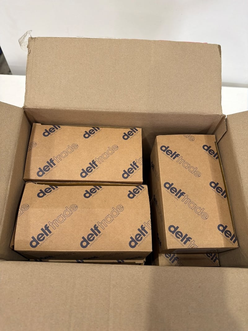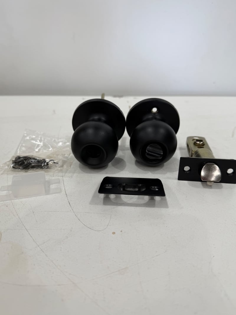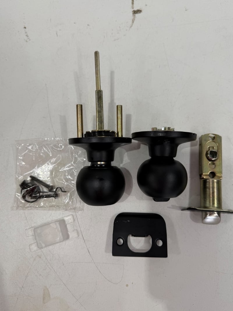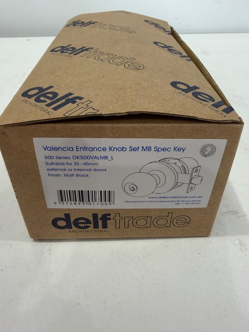 Box of Delftrade Valencia Entrance Knob Set MB Spec Key (Model DK500VALMB_L). Complete architectural hardware set finished in matt black, suitable for 35-45mm external or internal doors. Comprises pair of spherical black knobs with brass spindles, mortice lock mechanism with brass faceplate, black strike plate, and comprehensive installation hardware including screws. New, unused stock from reputable Australian architectural supplier. Note: The box contains 9 Knob Sets.