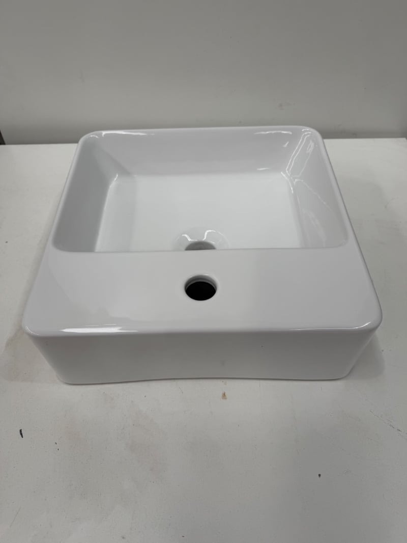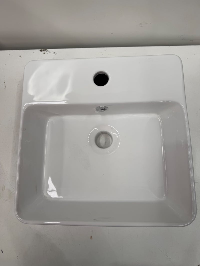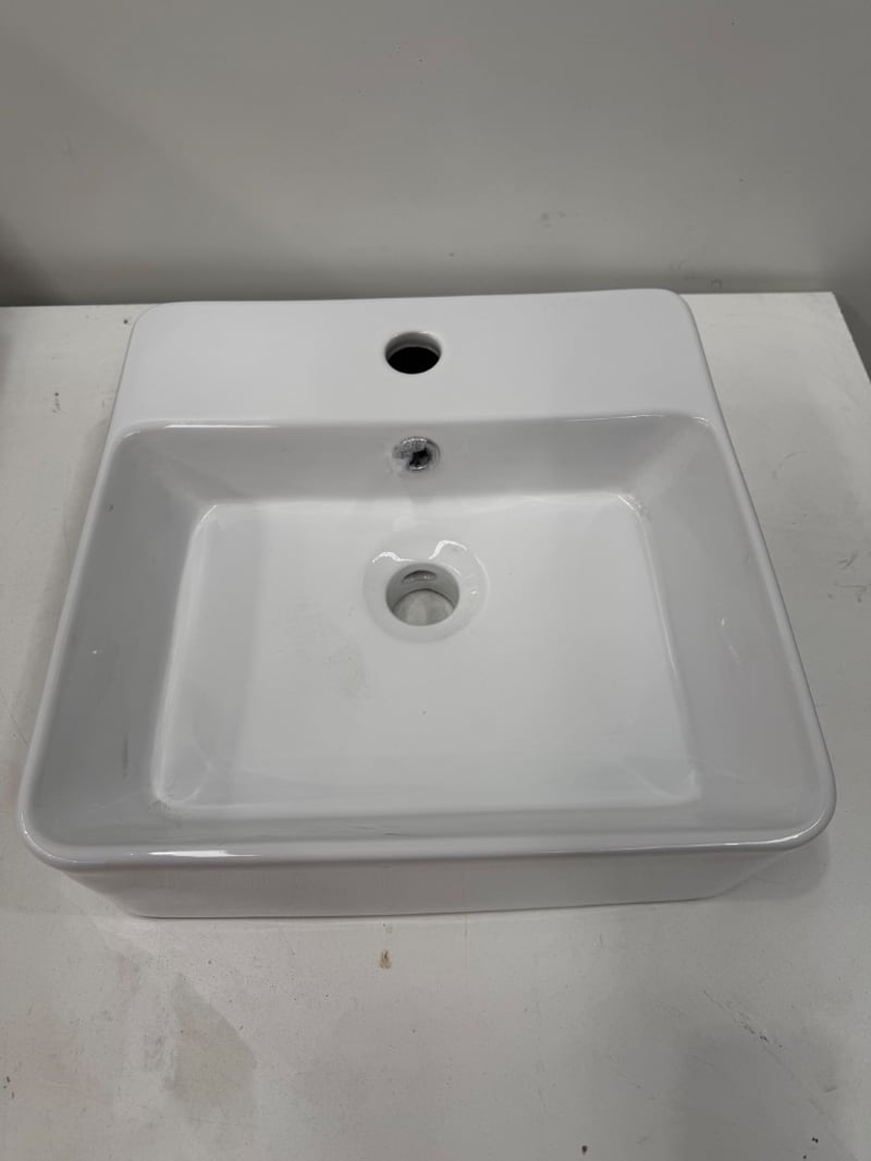 White ceramic above-counter basin sink, Brand: ECT Global, Model WB4148B. Features a sleek, modern rectangular design with rounded corners and glossy finish. Single tap hole positioned centrally on the rear deck. Interior basin dimensions approximately 380x380x125mm. Includes overflow drainage hole. Pristine condition, suitable for contemporary bathroom installations. Ideal for vanity units or wall-mounted configurations.