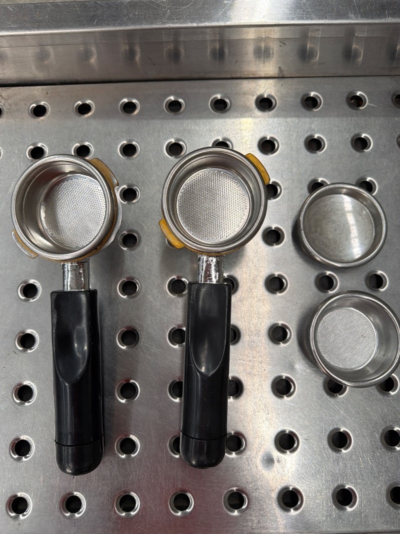 Model features stainless steel construction with dual brass-fitted portafilter groups, each with individual temperature gauges and steam valve controls. Machine equipped with 240 volts, single phase electrical supply (15 amps). Includes perforated drip tray with integrated cup warmer platform and dual steam wands with basket filters. Signs of wear consistent with previous use. Untested, sold as is.