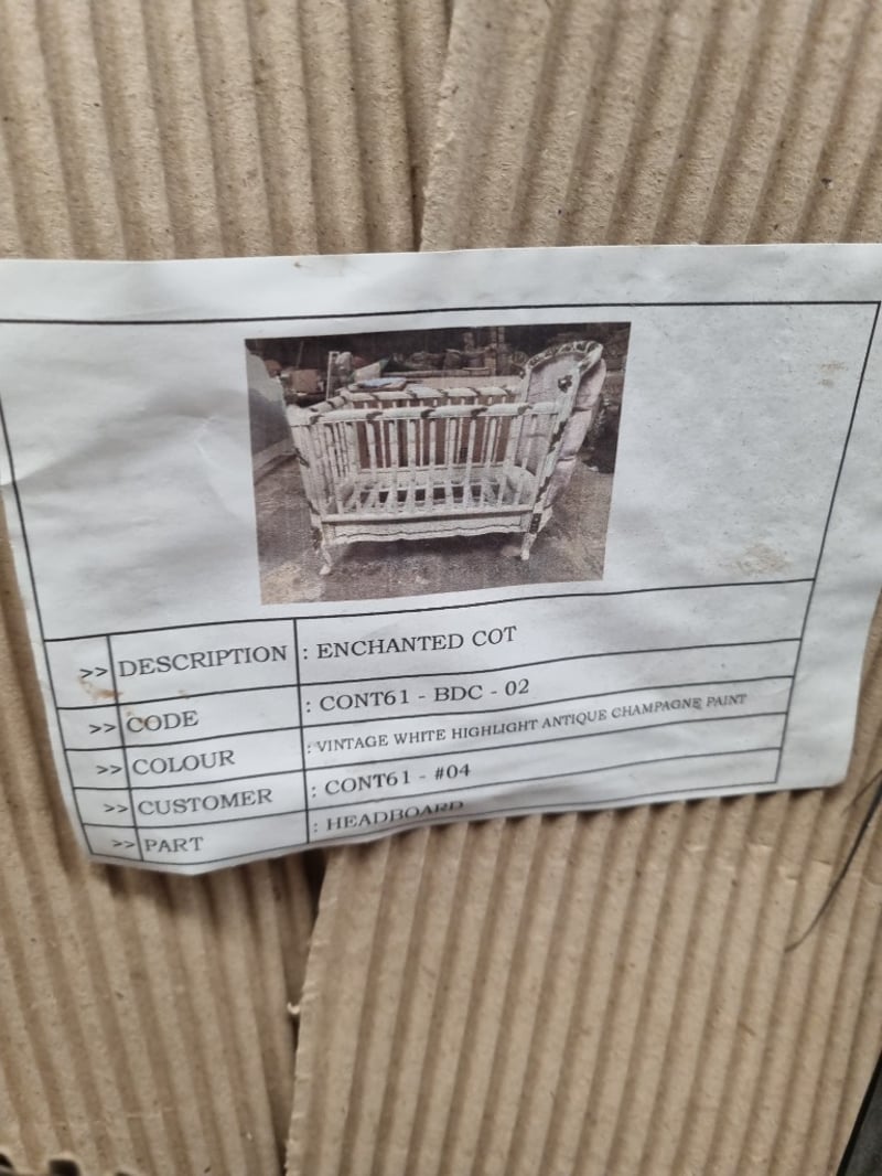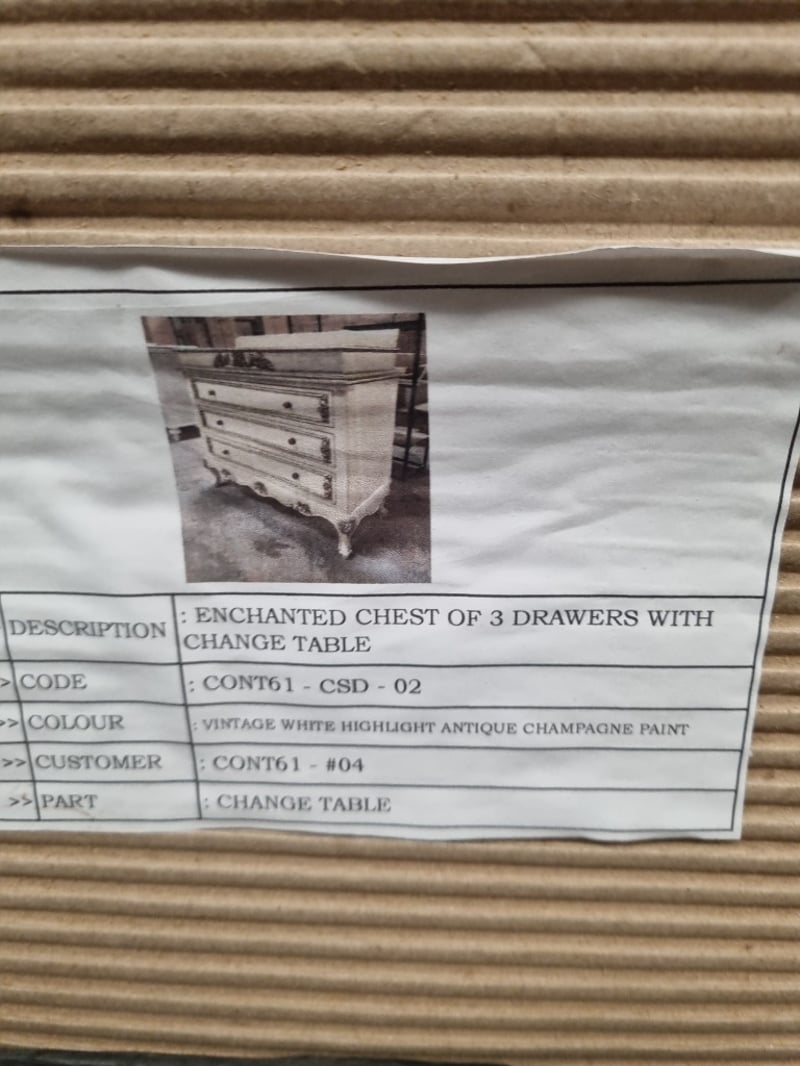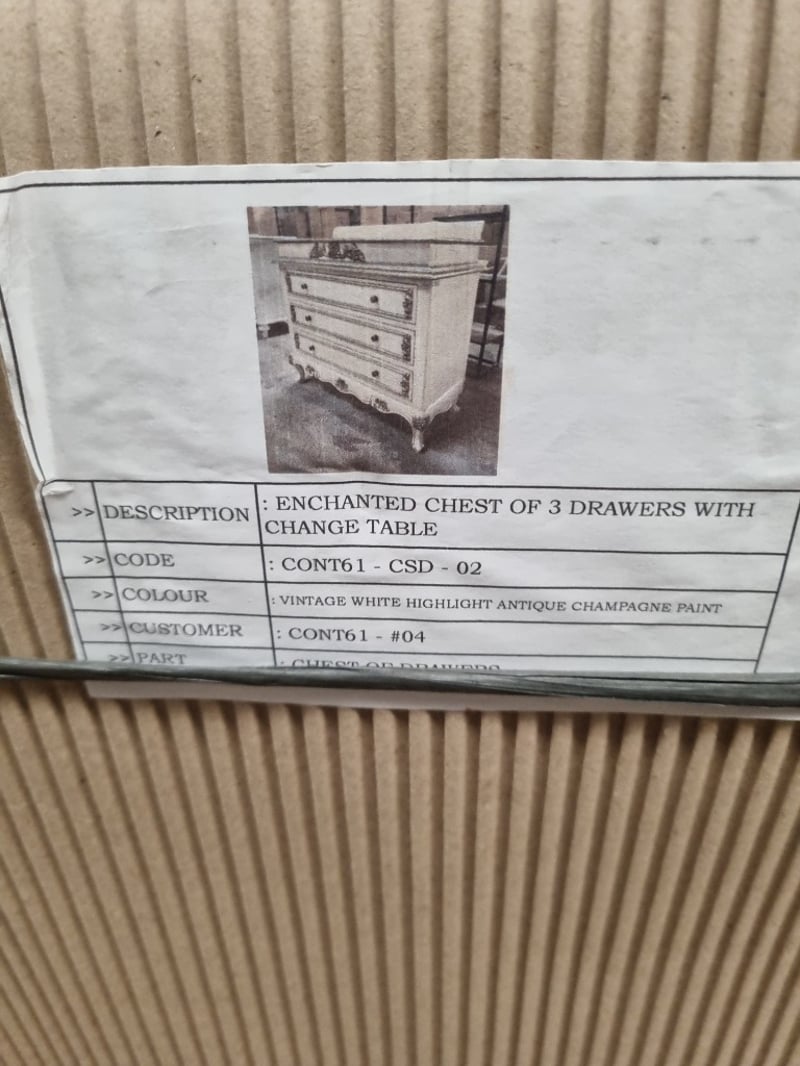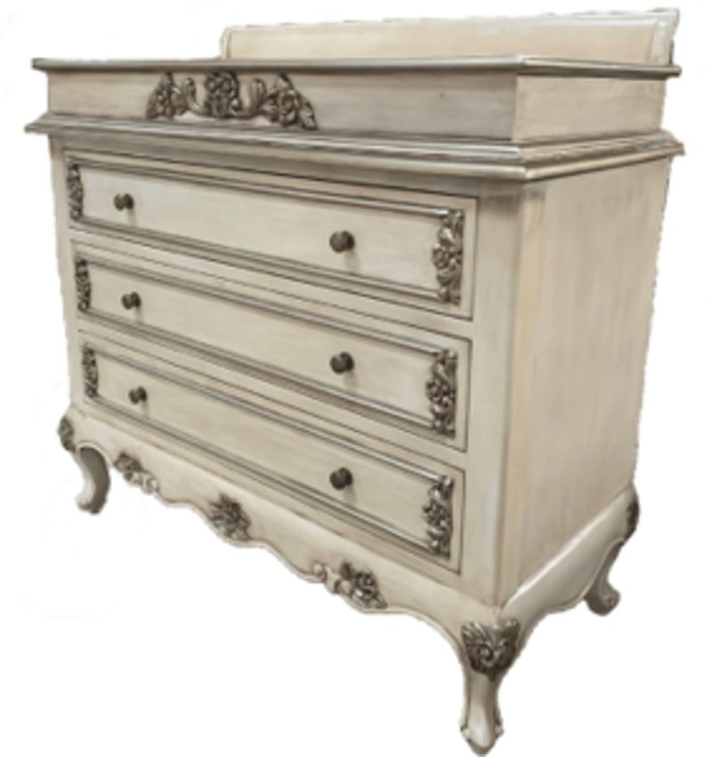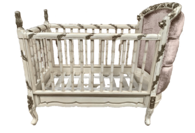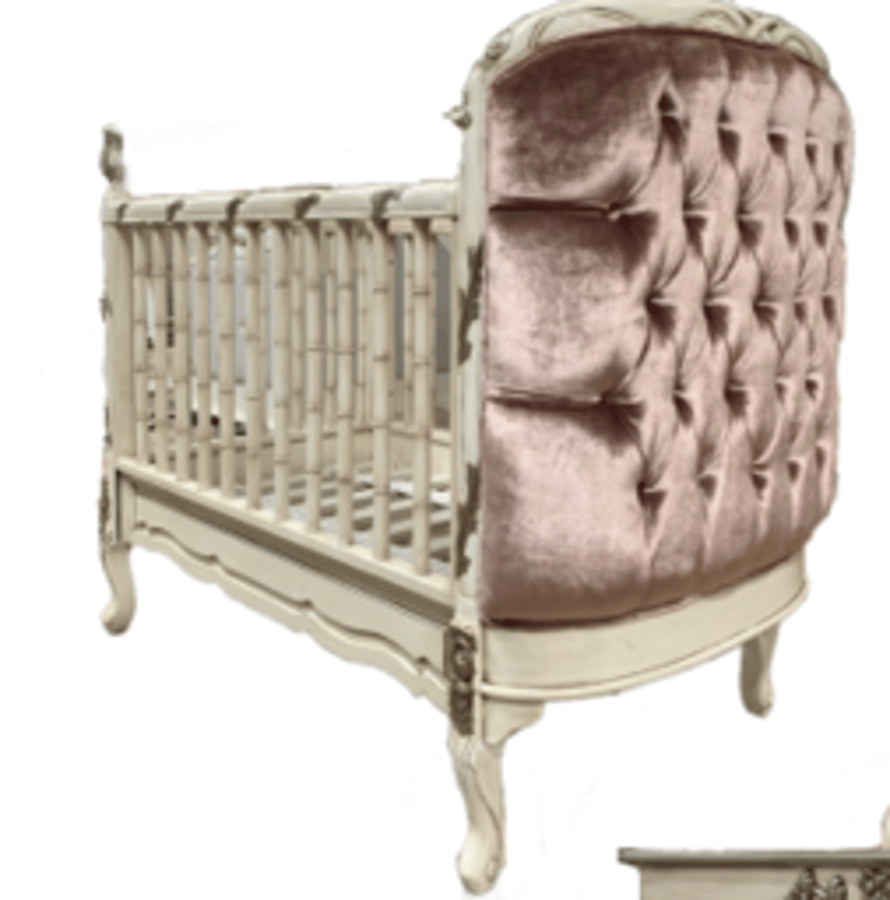Transform your nursery into a haven with this Enchanted cot with matching dresser. Featuring carvings of floral vines entwined together, it creates a captivating statement in your nursery. the wood finish is absolute bliss incorporating vintage white with champagne ascents, this set is truely one of a kind.