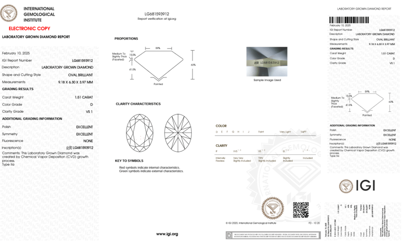This Extraordinary Oval Lab-Grown Diamond Is The Epitome Of Timeless Elegance And Modern Brilliance. With A Perfect D Color Grade, Ensuring It Is Completely Colorless And Exceptionally Rare, And Vs1 Clarity Grade, Meaning Inclusions Are Minimal And Only Visible Under Magnification, Ensuring The Diamond'S Brilliance. The Excellent Cut Maximizes The Stone'S Sparkle, While The Excellent Polish And Excellent Symmetry Enhance Its Overall Beauty. Certified By Igi (Report No. Lg681593912).