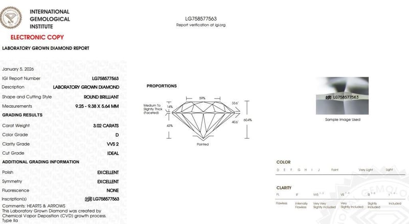 Please note that while all lab grown diamonds listed include certification, the report number or identification may vary upon arrival. This is due to standard manufacturing and batching processes. However, the diamond’s specifications — including carat, color, cut, and clarity — will match or may even exceed those advertised.