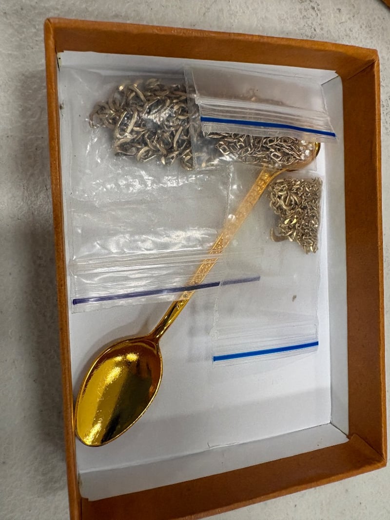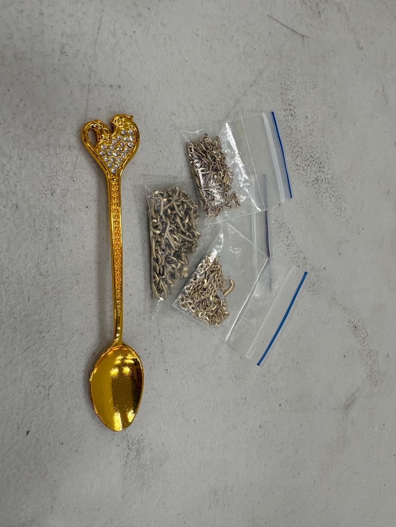 Teaspoon, Bronze Coloured with diamantés and Assorted Gold Coloured Chains