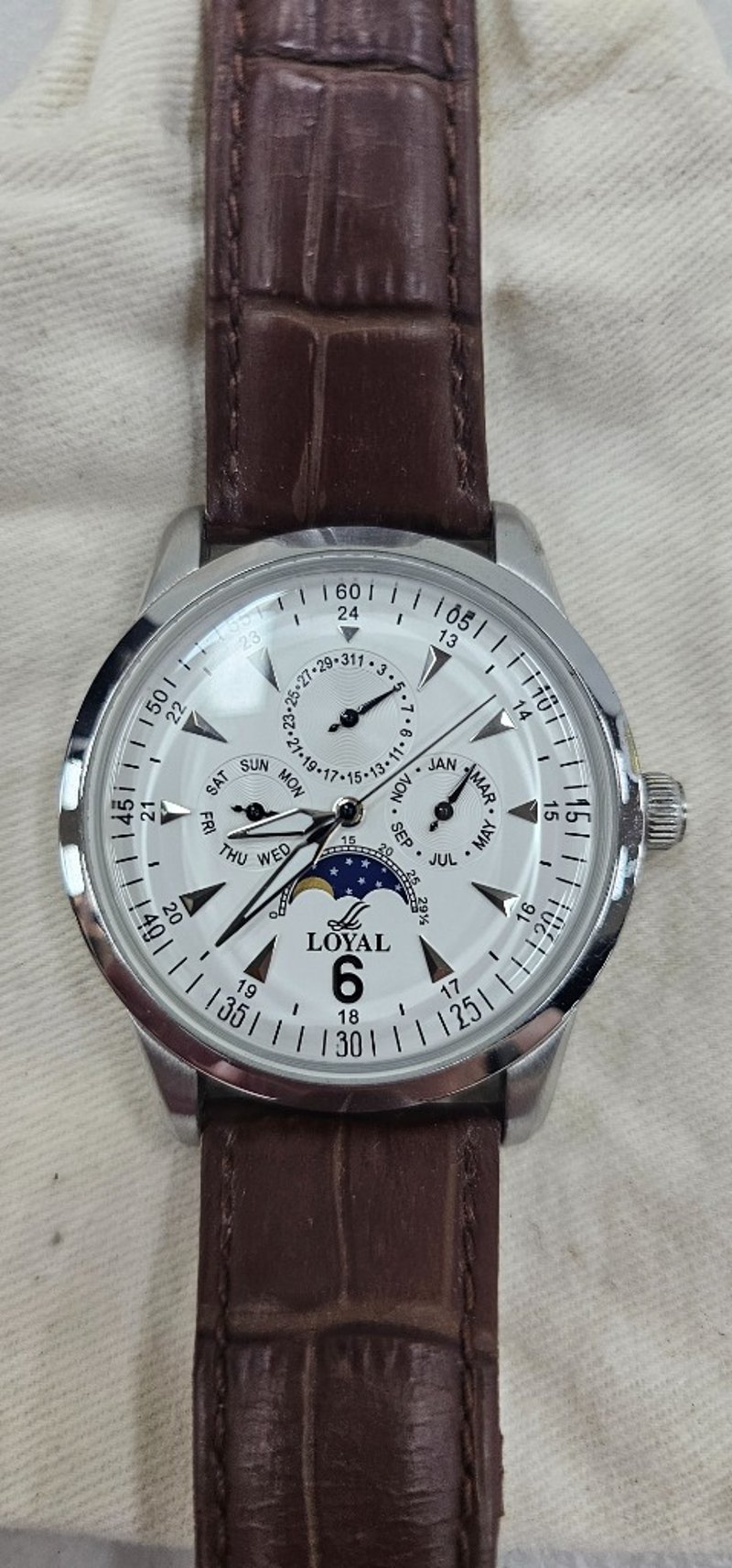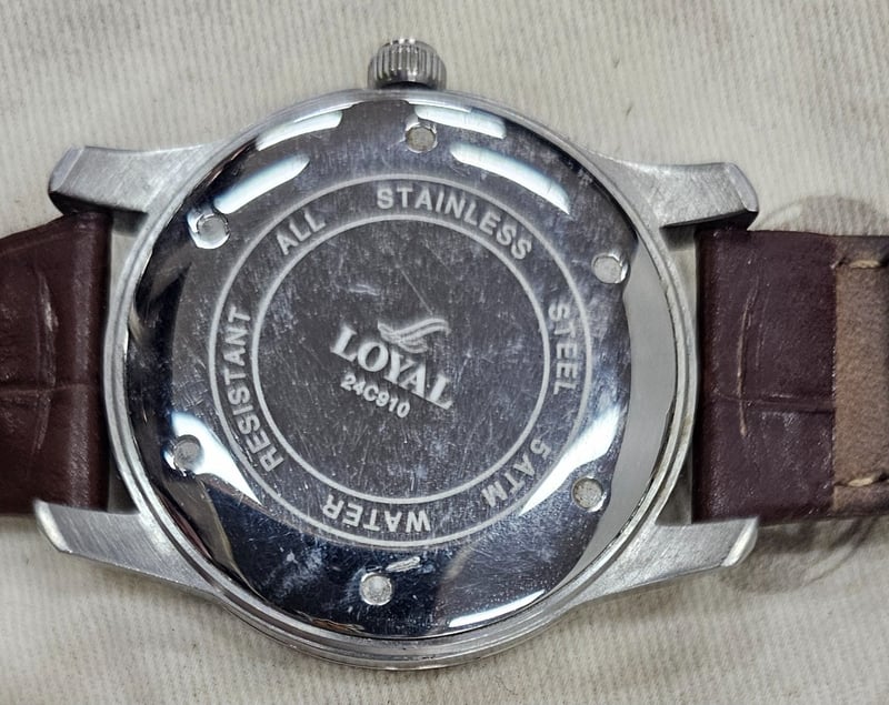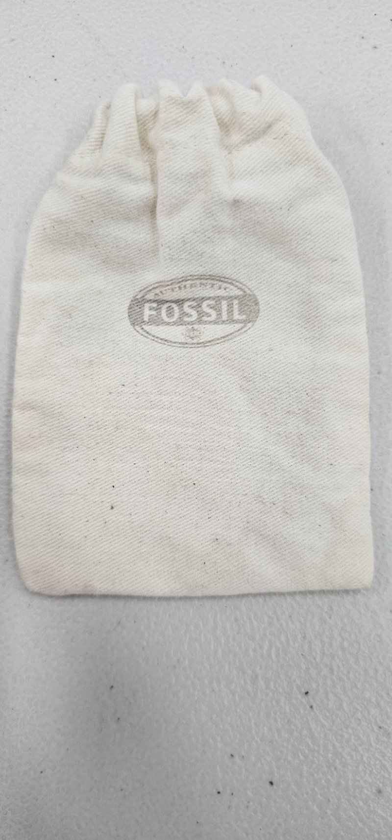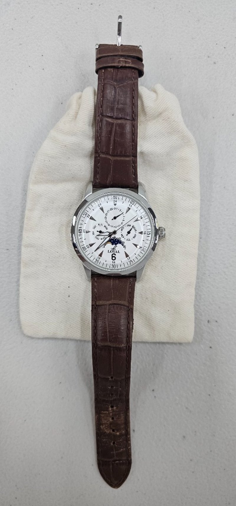Watch, brown coloured strap, tan cloth bag