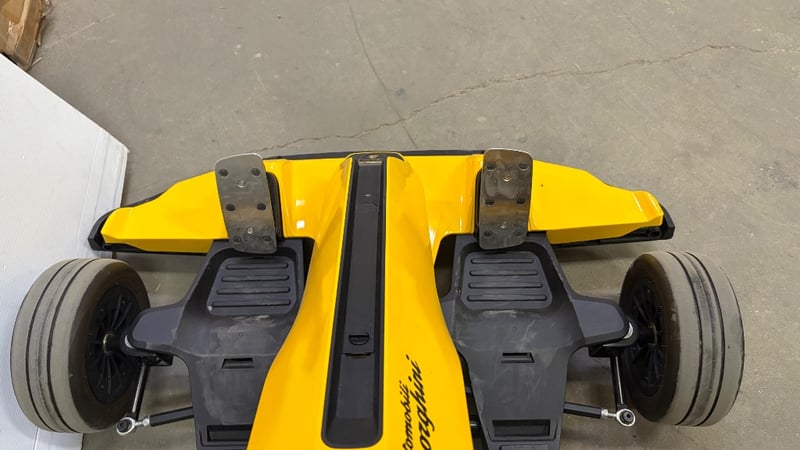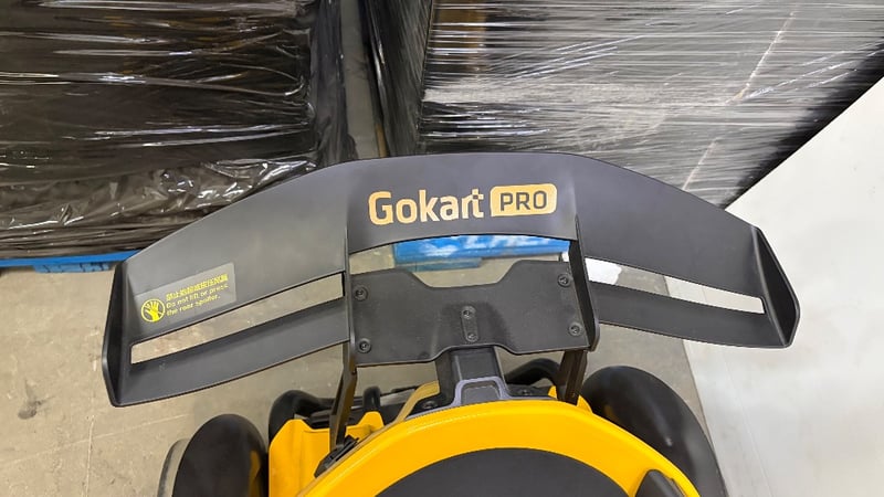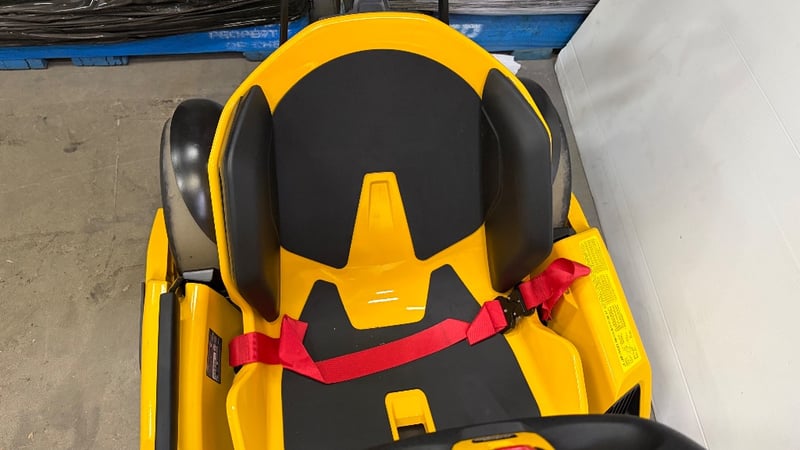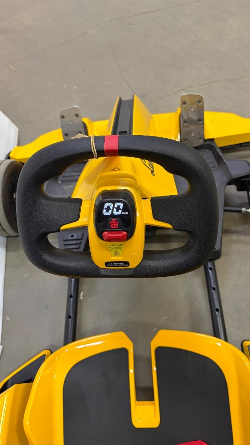 Electric Black and yellow finish go cart with seat belt, charger not included. Dimensions: 54cm (H), 138cm (W), 84cm (D)