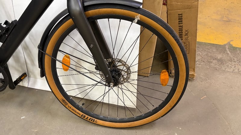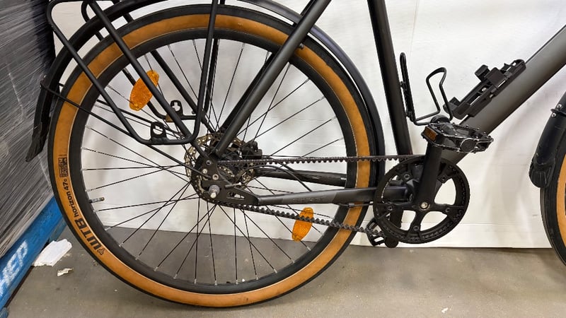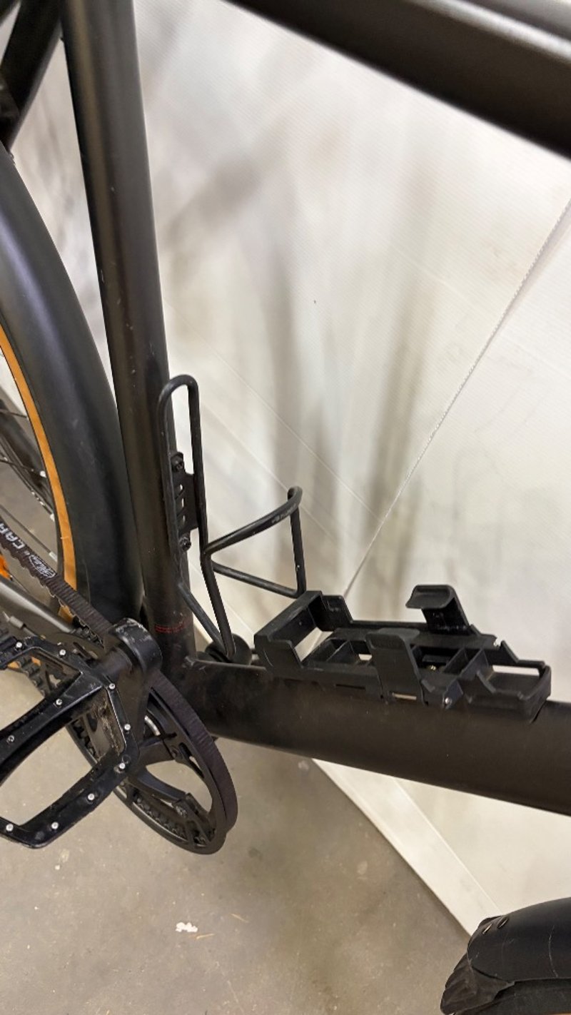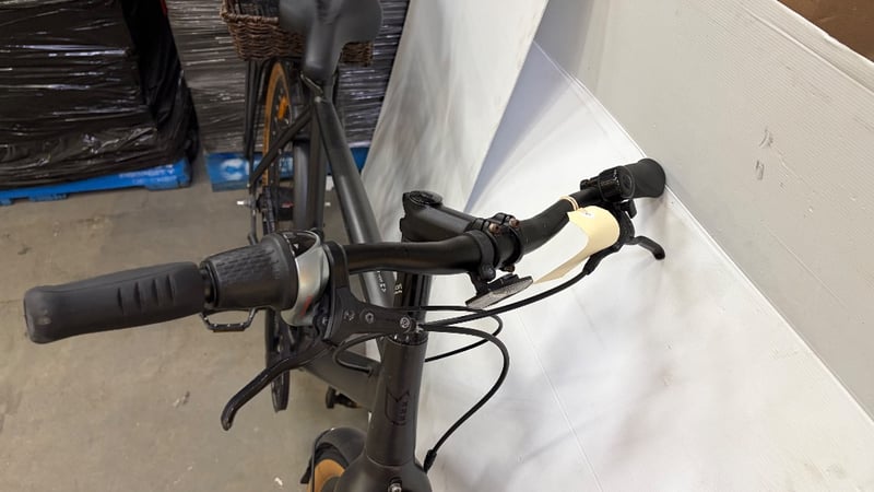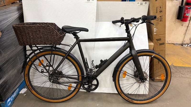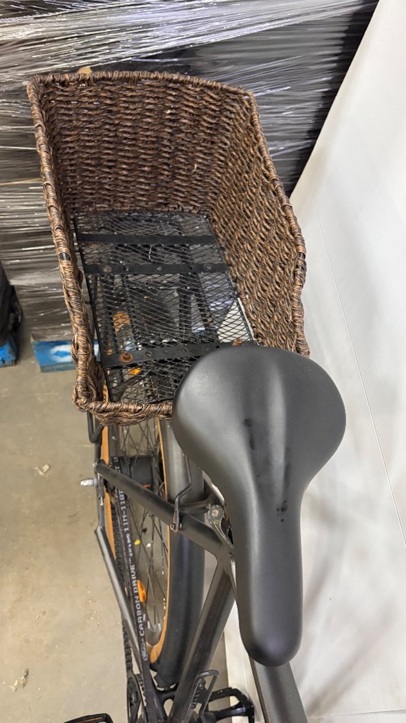 Black bike with basket, water bottle holder and gears.