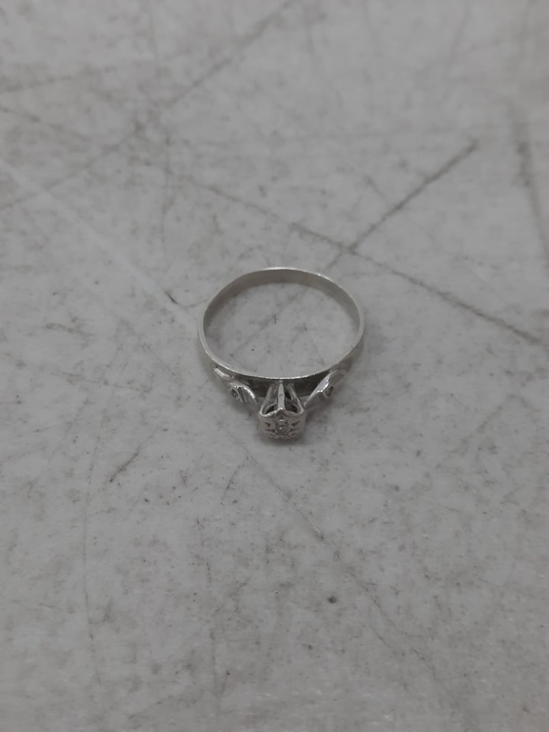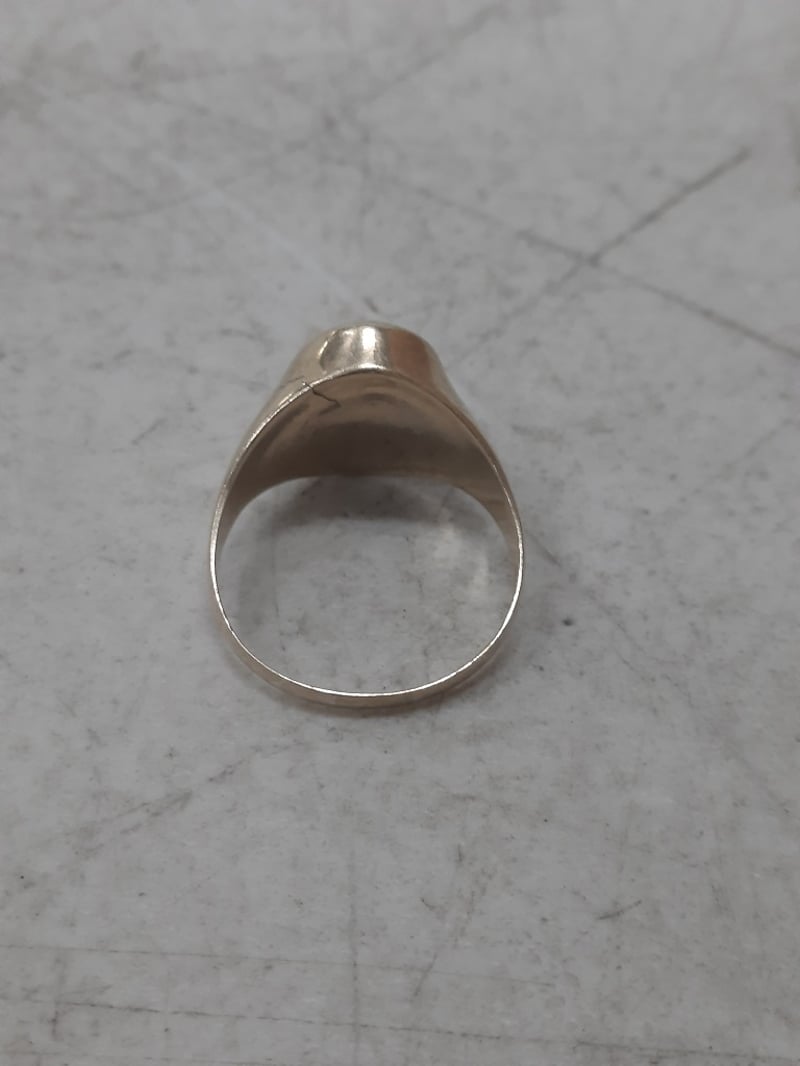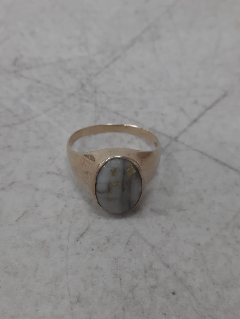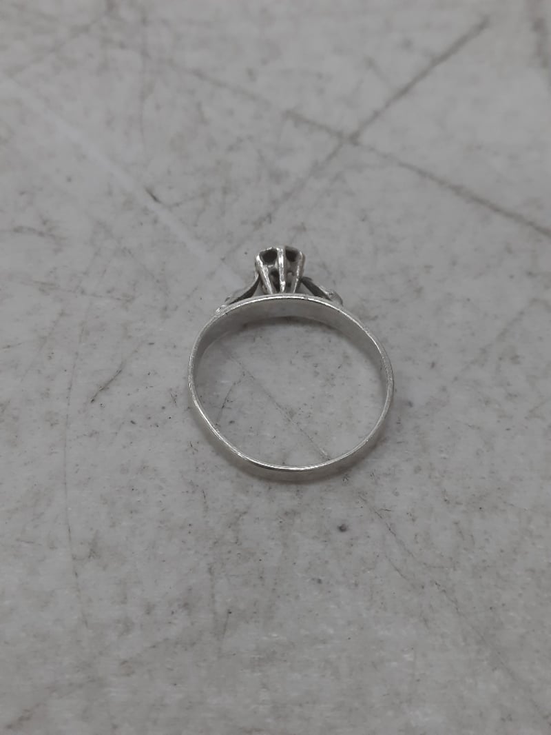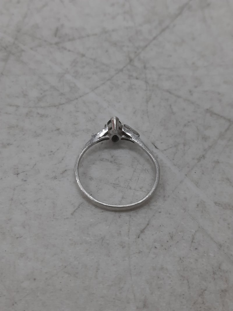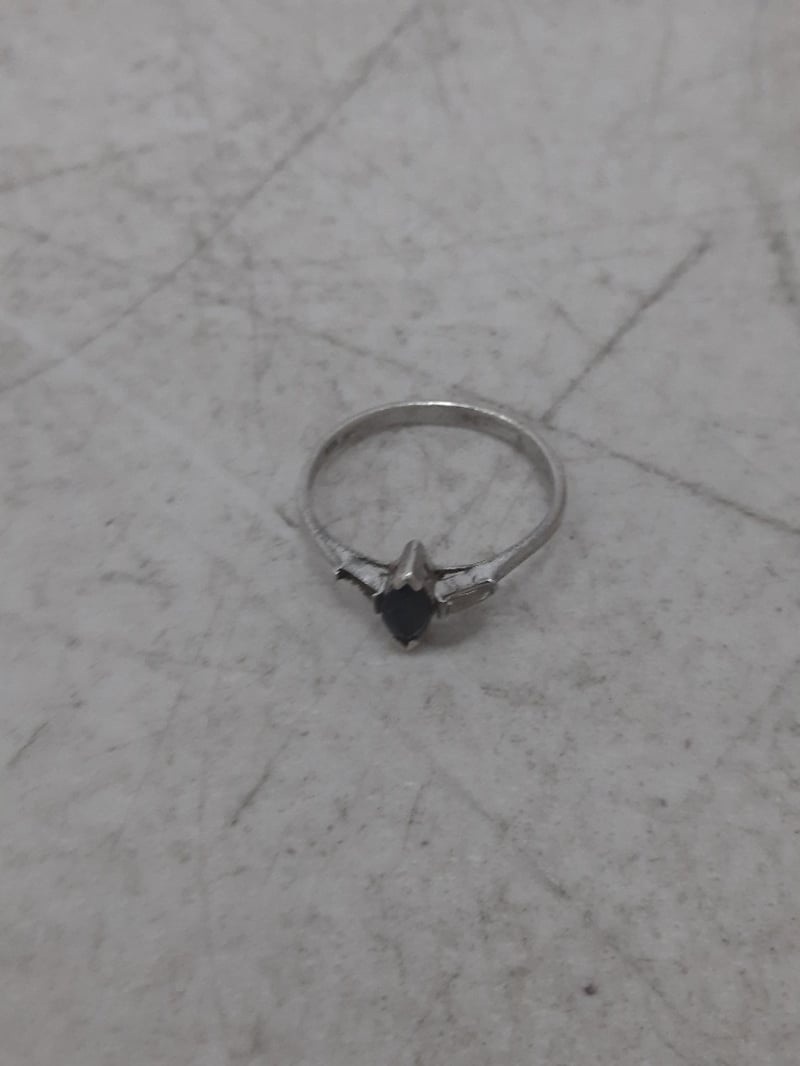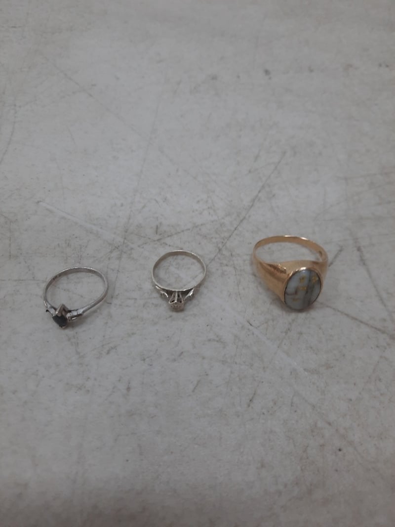 One silver coloured ring with black stone, one silver coloured ring with white stone and one gold coloured ring with blue stone SOLD AS LOT