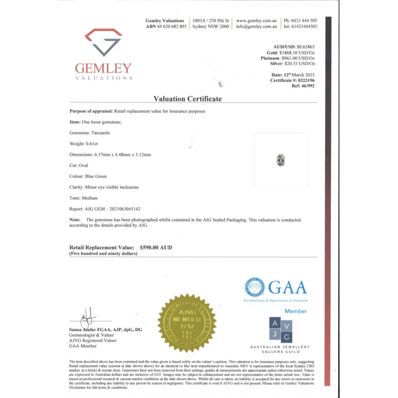 0.61CT CERTIFIED, NATURAL TANZANITE