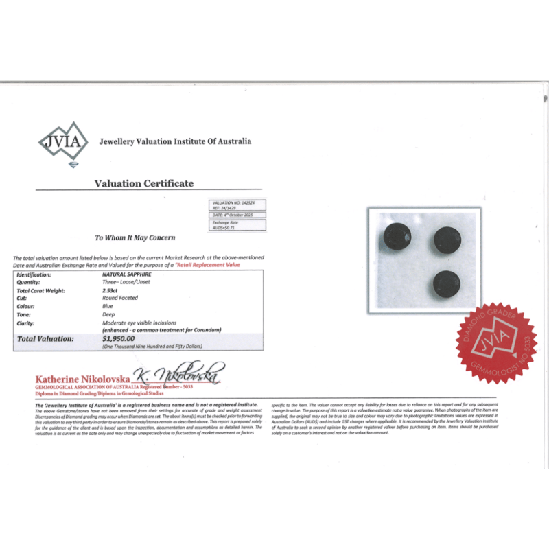 2.53CT TSW X 3, NATURAL SAPPHIRES Round Faceted Cut, Blue, Moderate Eye Visible Inclusions, Enhanced, Loose, Unset. Valuations Provided by an Independent Third-Party Professional Not Directly Associated With Lloyds Auctions at AUD $$1,950.00This valuation has been conducted by an independent third-party professional. The valuation amount is an assessment by the issuing valuer and does not reflect the auction value of the item. Any inquiries regarding the valuation should be directed to the issuing valuer (refer to contact details on the certificate), as Lloyds Auctions has no affiliation or influence over the valuation, the valuer, or the stated amount. Condition: Good - Refer Images 0645987+2110