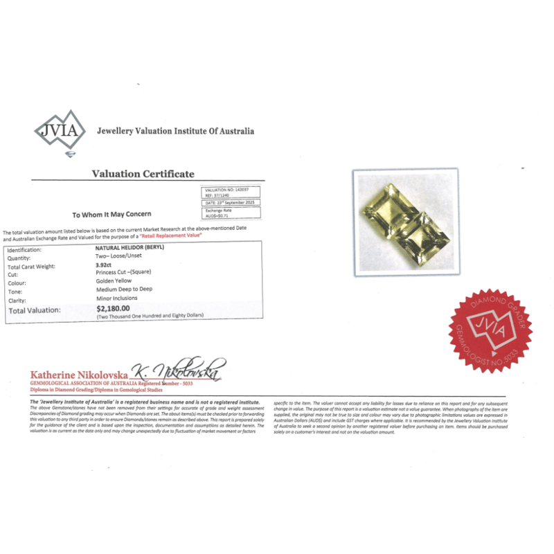 3.92CT TSW X 2, NATURAL BERYL HELIODOR Princess Cut, Medium Deep Golden Yellow, Minor Inclusions, Loose, Unset. Valuations Provided by an Independent Third-Party Professional Not Directly Associated With Lloyds Auctions at AUD $$2,180.00This valuation has been conducted by an independent third-party professional. The valuation amount is an assessment by the issuing valuer and does not reflect the auction value of the item. Any inquiries regarding the valuation should be directed to the issuing valuer (refer to contact details on the certificate), as Lloyds Auctions has no affiliation or influence over the valuation, the valuer, or the stated amount. Condition: Good - Refer Images 0645987+2123