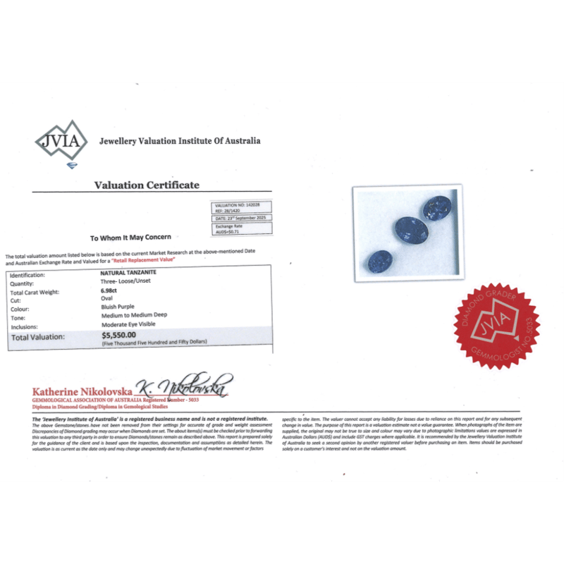6.98CT TSW X 3, NATURAL TANZANITES Oval Cut, Medium-Deep Bluish-Purple, Moderate Eye Visible Inclusions, Loose, Unset. Valuations Provided by an Independent Third-Party Professional Not Directly Associated With Lloyds Auctions at AUD $$5,550.00This valuation has been conducted by an independent third-party professional. The valuation amount is an assessment by the issuing valuer and does not reflect the auction value of the item. Any inquiries regarding the valuation should be directed to the issuing valuer (refer to contact details on the certificate), as Lloyds Auctions has no affiliation or influence over the valuation, the valuer, or the stated amount. Condition: Good - Refer Images 0645987+2129