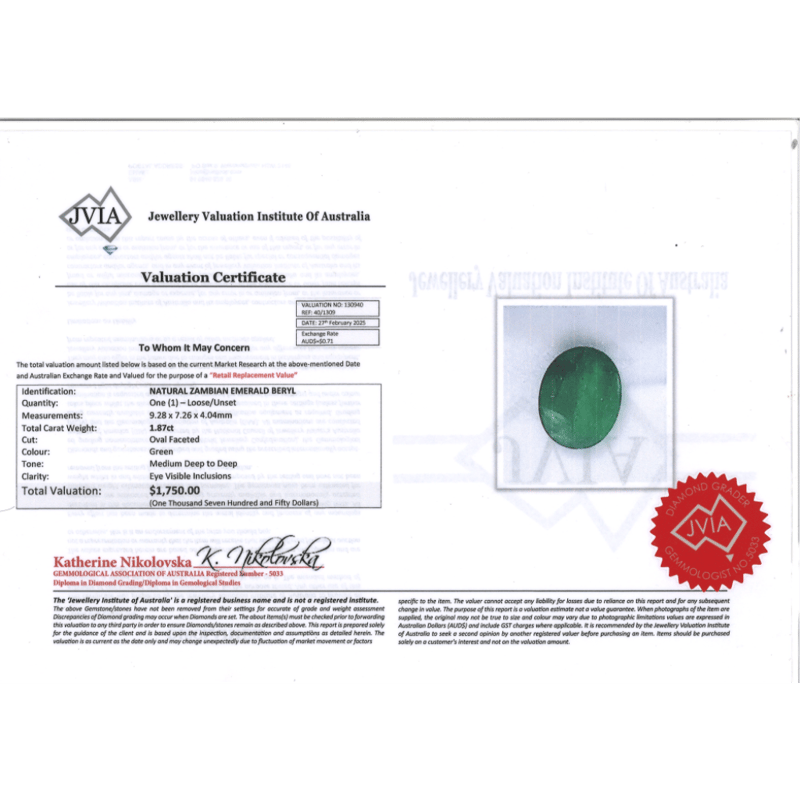 1.87CT NATURAL ZAMBIAN EMERALD Oval Cut, Medium Deep Green, Eye Visible Inclusions, Zambian Origin, Loose, Unset. Valuations Provided by an Independent Third-Party Professional Not Directly Associated With Lloyds Auctions at AUD $$1,750.00This valuation has been conducted by an independent third-party professional. The valuation amount is an assessment by the issuing valuer and does not reflect the auction value of the item. Any inquiries regarding the valuation should be directed to the issuing valuer (refer to contact details on the certificate), as Lloyds Auctions has no affiliation or influence over the valuation, the valuer, or the stated amount. Condition: Good - Refer Images 0645987+2134
