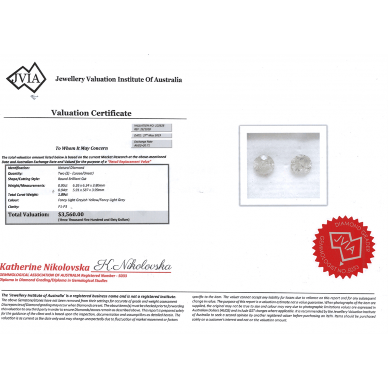 1.89CT TDW X 2, NATURAL FANCY GREY/YELLOW DIAMONDS Round Brilliant Cut, Light Fancy Greyish-Yellow/Fancy Light Grey Colour, P1-P3 Clarity, Loose, Unset. Valuations Provided by an Independent Third-Party Professional Not Directly Associated With Lloyds Auctions at AUD $$3,560.00This valuation has been conducted by an independent third-party professional. The valuation amount is an assessment by the issuing valuer and does not reflect the auction value of the item. Any inquiries regarding the valuation should be directed to the issuing valuer (refer to contact details on the certificate), as Lloyds Auctions has no affiliation or influence over the valuation, the valuer, or the stated amount. Condition: Good - Refer Images 0645987+2142