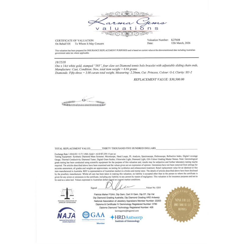 14K WHITE GOLD AND 3.00CT TDW DIAMOND, BOLO TENNIS BRACELET. The Bracelet Features, 53 Princess Cut, Diamonds (3.00Ct Tdw, G-I Colour, Si1-2 Clarity), Claw Set. The Bracelet Features An Adjustable Sliding Chain. Valuations Provided by an Independent Third-Party Professional Not Directly Associated With Lloyds Auctions at AUD $$30,500.00This valuation has been conducted by an independent third-party professional. The valuation amount is an assessment by the issuing valuer and does not reflect the auction value of the item. Any inquiries regarding the valuation should be directed to the issuing valuer (refer to contact details on the certificate), as Lloyds Auctions has no affiliation or influence over the valuation, the valuer, or the stated amount. Condition: Good - Refer Images 0645988+104