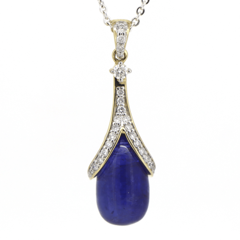 14K YELLOW GOLD, 11.15CT TANZANITE AND DIAMOND, DROP PENDANT. The Design Features, One Vivid Blue, Drop Cut, Tanzanite (11.15Ct, Moderate-Heavy Natural Inclusions), Bead And Cap Set. Encompassing The Design Are, 24 Round Brilliant Cut, Diamonds (0.29Ct Tdw, H-J Colour, Si-I1+ Clarity), Claw/Bead Set. Valuations Provided by an Independent Third-Party Professional Not Directly Associated With Lloyds Auctions at AUD $$11,500.00This valuation has been conducted by an independent third-party professional. The valuation amount is an assessment by the issuing valuer and does not reflect the auction value of the item. Any inquiries regarding the valuation should be directed to the issuing valuer (refer to contact details on the certificate), as Lloyds Auctions has no affiliation or influence over the valuation, the valuer, or the stated amount. Condition: Good - Refer Images 0645988+123