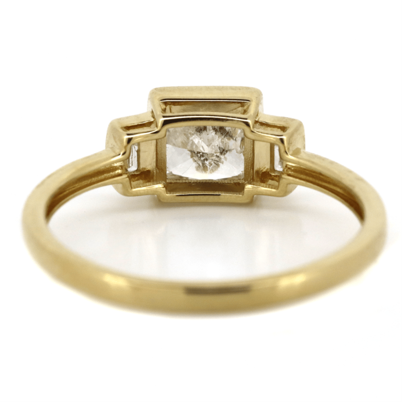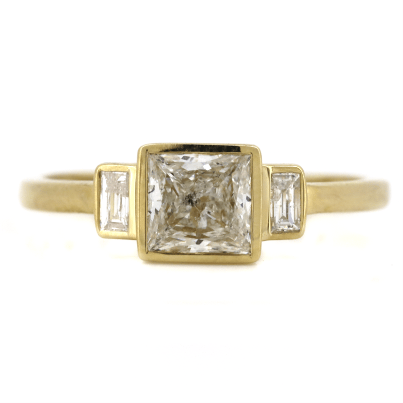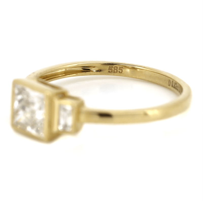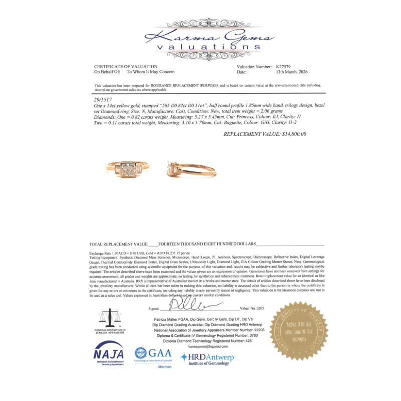 14K YELLOW GOLD AND DIAMOND, TRILOGY RING. The Centre Features, One Princess Cut, Diamond (0.82Ct, I-J Colour, I1 Clarity), Bezel Set. Flanking The Centre Are, 2 Baguette Cut, Diamonds (0.11Ct Tdw, G-H Colour, I1-2 Clarity), Bezel Set. Ring Size N. Valuations Provided by an Independent Third-Party Professional Not Directly Associated With Lloyds Auctions at AUD $$14,800.00This valuation has been conducted by an independent third-party professional. The valuation amount is an assessment by the issuing valuer and does not reflect the auction value of the item. Any inquiries regarding the valuation should be directed to the issuing valuer (refer to contact details on the certificate), as Lloyds Auctions has no affiliation or influence over the valuation, the valuer, or the stated amount. Condition: Good - Refer Images 0645988+101