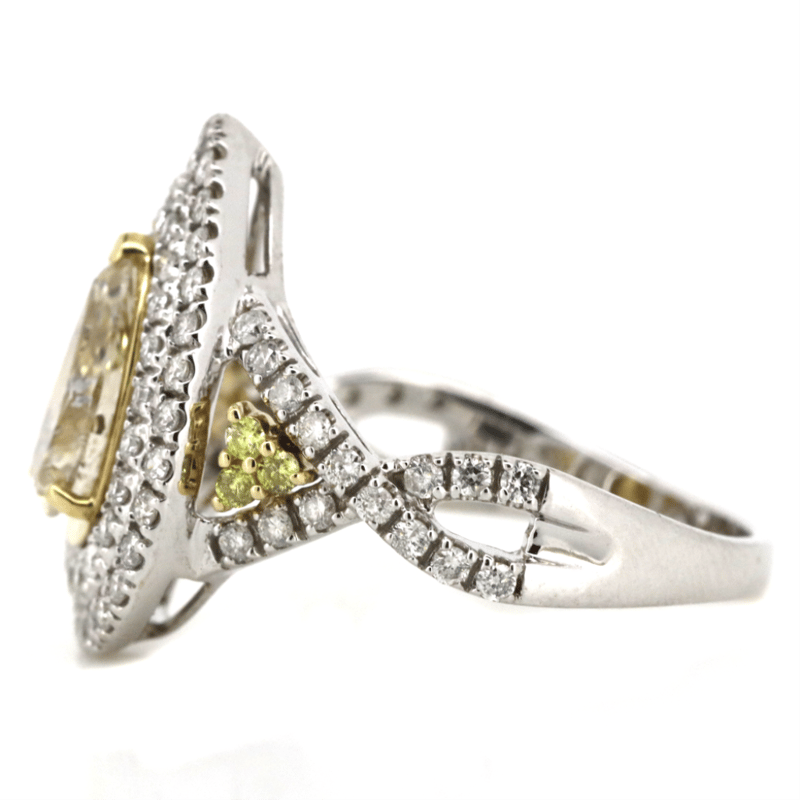 14K WHITE/YELLOW GOLD, FANCY YELLOW DIAMOND AND DIAMOND, DOUBLE HALO TWIST BAND RING.