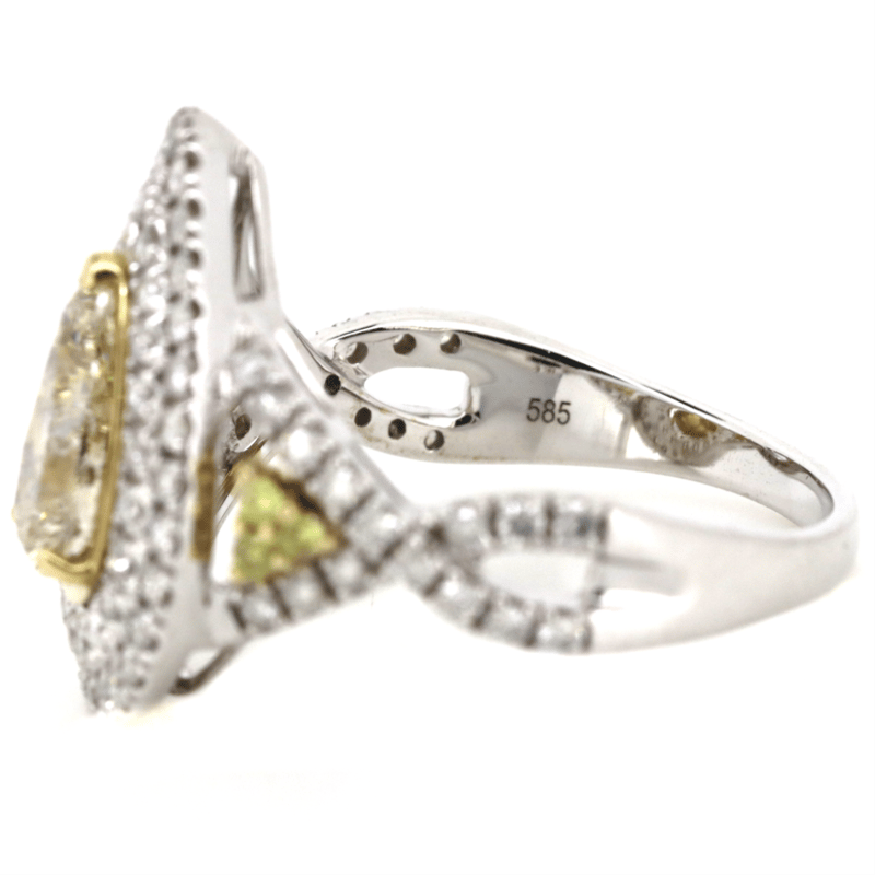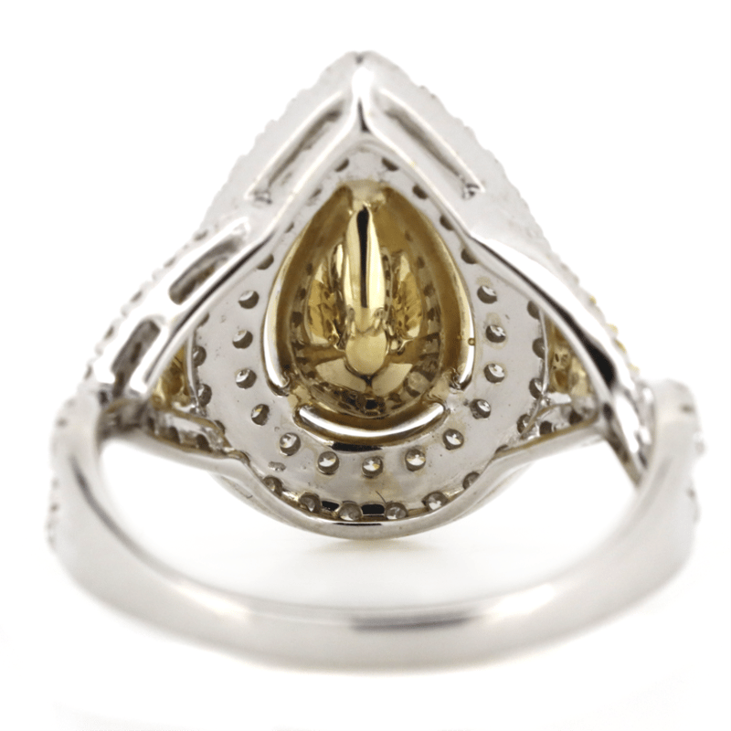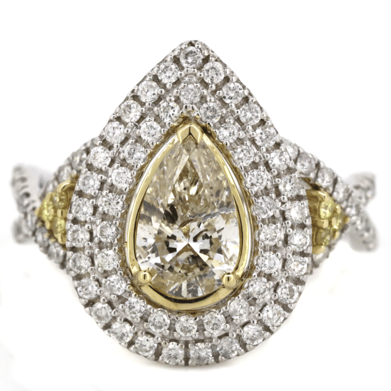 The Centre Features, One Pear Brilliant Cut, Fancy Light Yellow, Diamond (1.02Ct, Vs1 Clarity), 3 Claw Set In Yellow Gold. Encompassing The Centre Are, 6 Round Brilliant Cut, Fancy Vivid Yellow, Diamonds (0.22Ct Tdw, Vs1 Clarity), Claw Set. Surrounding The Centre In A Double Halo And Decorating The Twist Band Are, 81 Round Brilliant Cut, Diamonds (0.45Ct Tdw, G-H Colour, Si1-Si2 Clarity), Claw Set. Ring Size M 1/2.