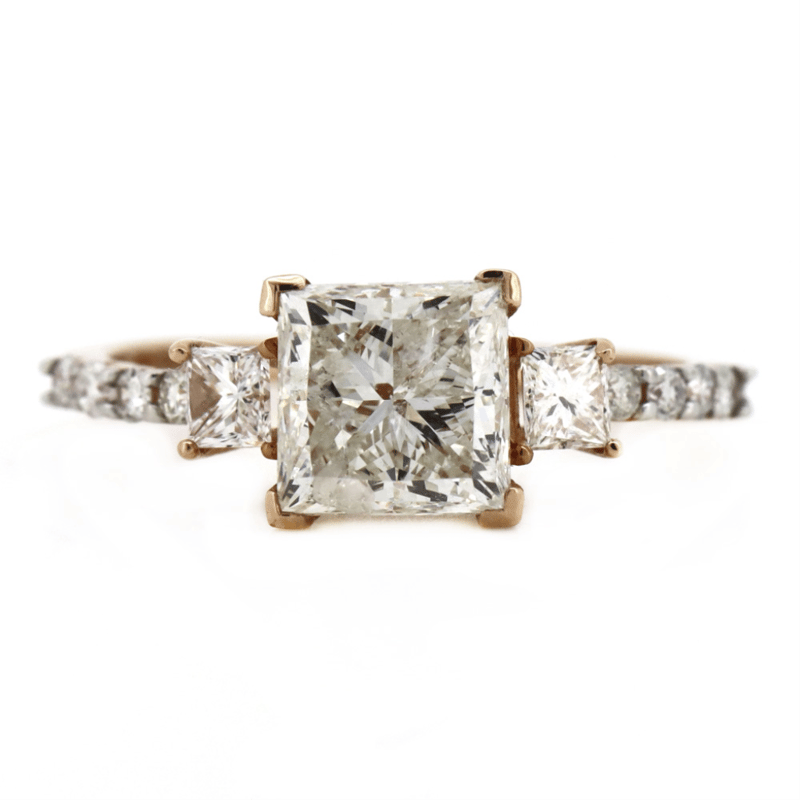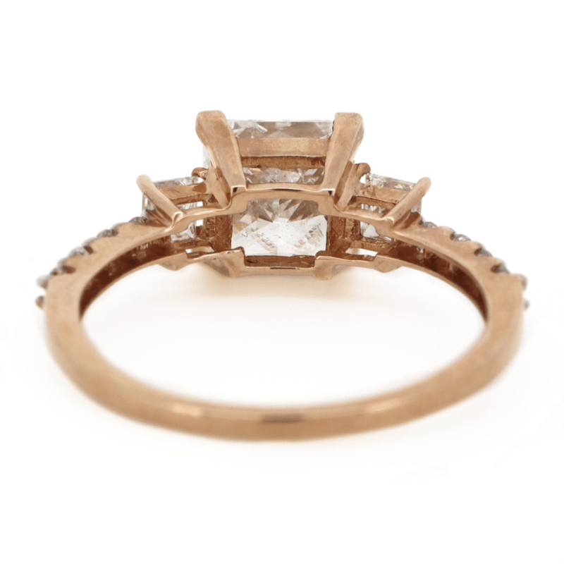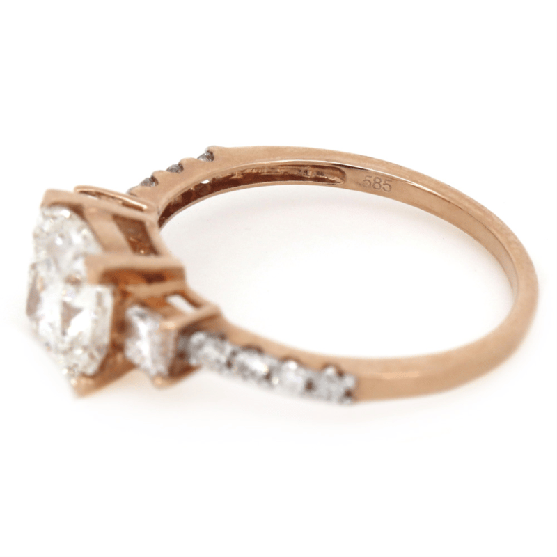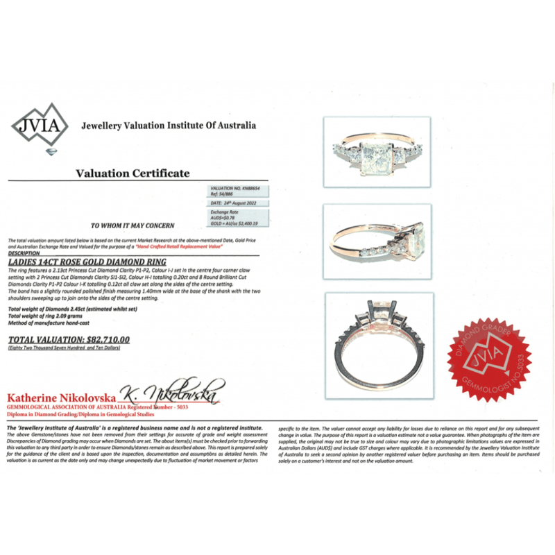 14K ROSE GOLD AND DIAMOND, TRILOGY RING. The Centre Features, One Princess Cut, Diamond (2.13Ct Tdw, I-J Colour, P1-P2 Clarity), 4 Corner Claw Set. Flanking Either Side Of The Centre Are, 2 Princess Cut, Diamonds (0.20Ct Tdw, H-I Colour, Si1-Si2 Clarity), Claw Set. Decorating The Band Are, 8 Round Brilliant Cut, Diamonds (0.12Ct Tdw, I-K Colour, P1-P2 Clarity), Claw Set. Ring Size M 1/2. Valuations Provided by an Independent Third-Party Professional Not Directly Associated With Lloyds Auctions at AUD $$82,710.00This valuation has been conducted by an independent third-party professional. The valuation amount is an assessment by the issuing valuer and does not reflect the auction value of the item. Any inquiries regarding the valuation should be directed to the issuing valuer (refer to contact details on the certificate), as Lloyds Auctions has no affiliation or influence over the valuation, the valuer, or the stated amount. Condition: Good - Refer Images 0645988+173