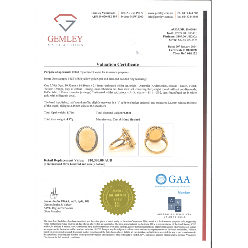 The Centre Features, One Oval Cabochon Cut, Australian Andamooka Opal (5.76Ct, Green, Violet, Yellow And Orange Colour Play), Claw Set. Surrounding The Centre Are, 38 Round Brilliant Cut, Diamonds (0.46Ct Tdw, J-K Colour, Si1-Si2 Clarity), Semi-Bezel/Bead Set In White Gold. Ring Size O 1/2.