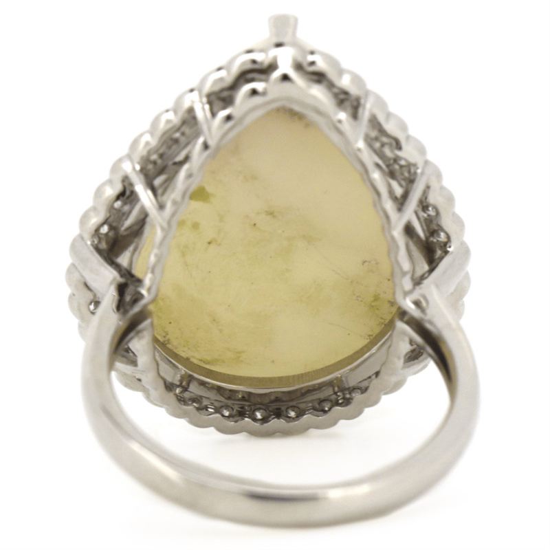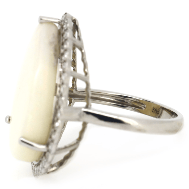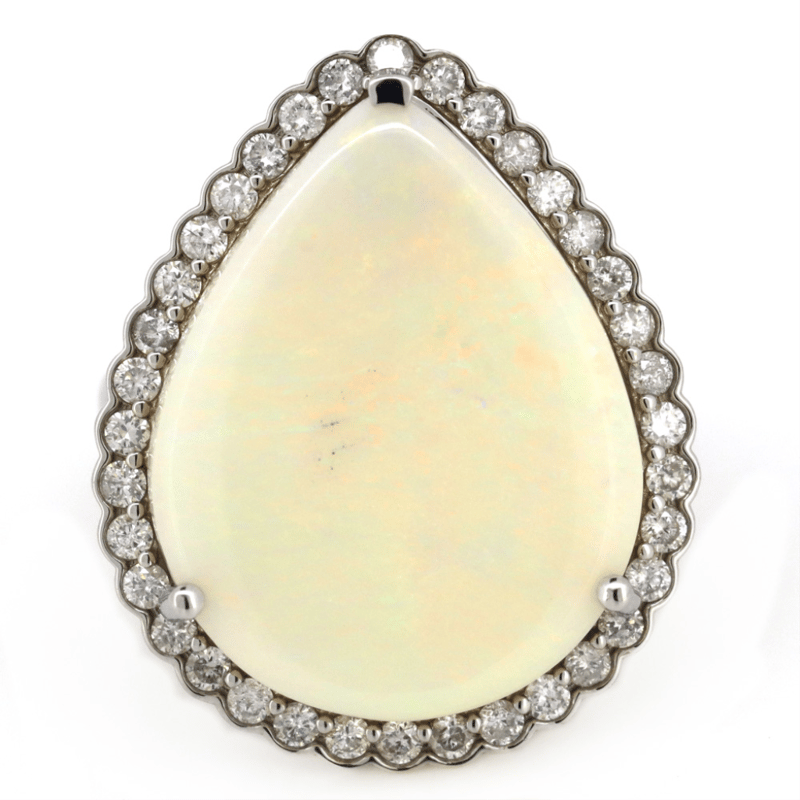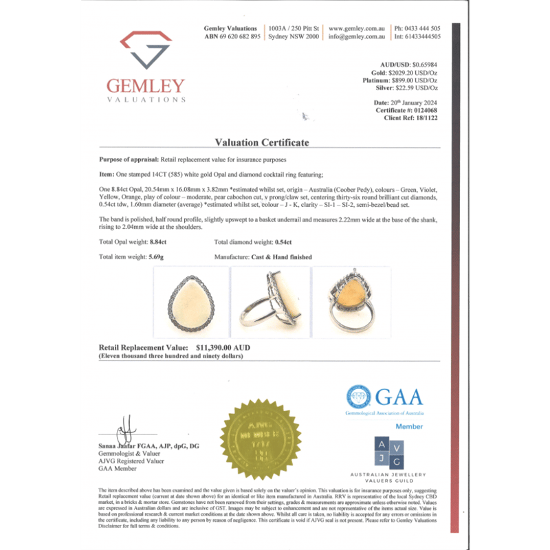 14K WHITE GOLD, 8.84CT AUSTRALIAN COOBER PEDY OPAL AND DIAMOND, HALO RING. The Centre Features, One Pear Cabochon Cut, Australian Coober Pedy Opal (8.84Ct, Green, Violet, Yellow And Orange Colour Play), Claw Set. Surrounding The Centre Are, 36 Round Brilliant Cut, Diamonds (0.54Ct Tdw, J-K Colour, Si1-Si2 Clarity), Semi-Bezel/Bead Set. Ring Size L. Valuations Provided by an Independent Third-Party Professional Not Directly Associated With Lloyds Auctions at AUD $$11,390.00This valuation has been conducted by an independent third-party professional. The valuation amount is an assessment by the issuing valuer and does not reflect the auction value of the item. Any inquiries regarding the valuation should be directed to the issuing valuer (refer to contact details on the certificate), as Lloyds Auctions has no affiliation or influence over the valuation, the valuer, or the stated amount. Condition: Good - Refer Images 0645988+164