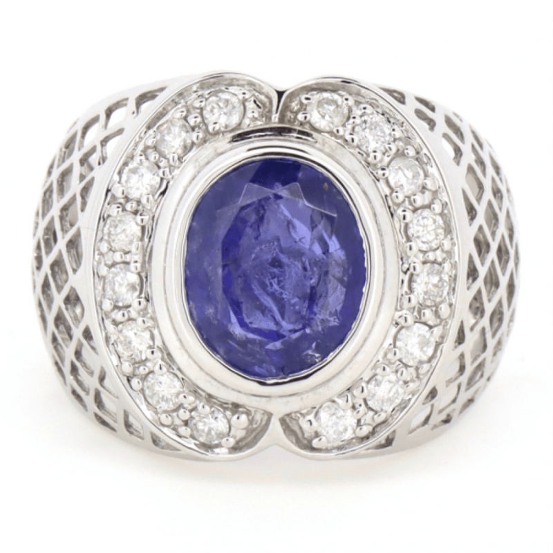 14K WHITE GOLD, TANZANITE AND DIAMOND, GENTS RING.