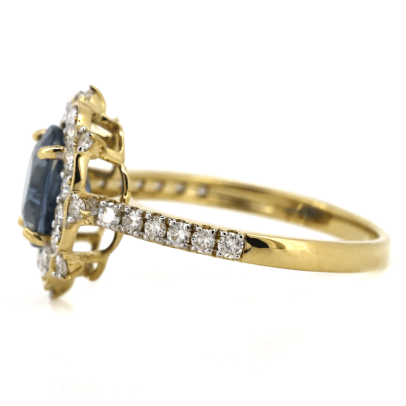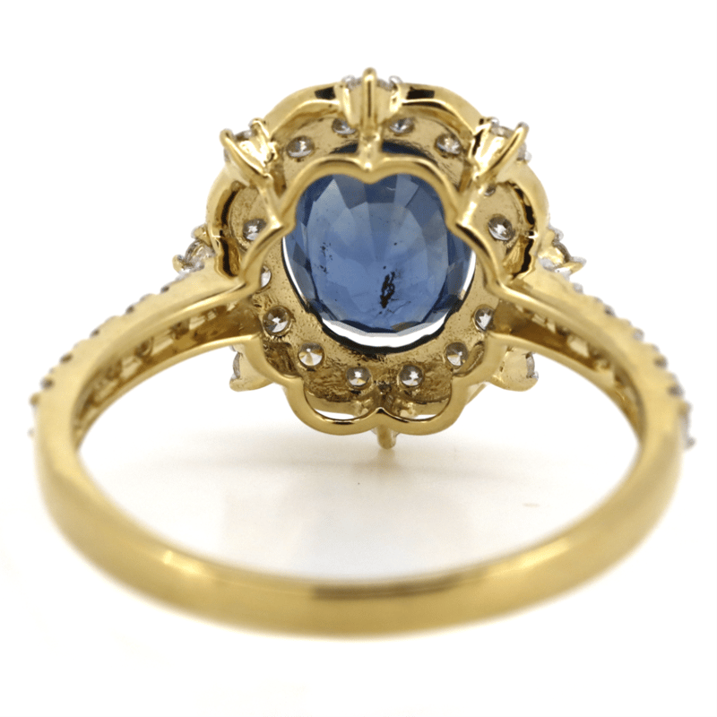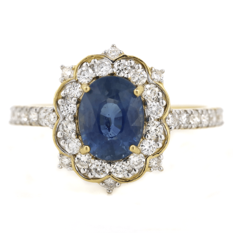 The Centre Features, One Oval Cut, Ceylon Sapphire (1.88Ct, Light Natural Inclusions), Claw Set. Decorating The Halo And The Band Are, 36 Round Brilliant Cut, Diamonds (0.55Ct Tdw, G-J Colour, Si-I2 Clarity), Bead Set. Ring Size N.
