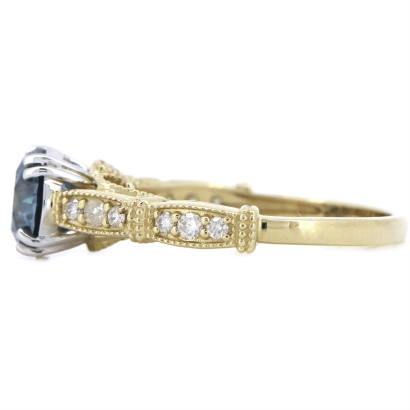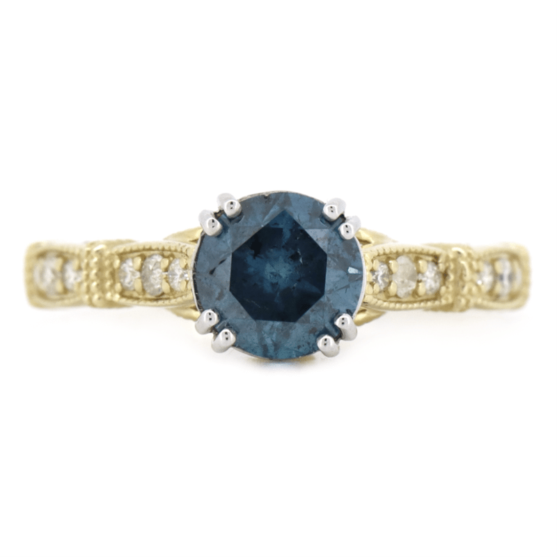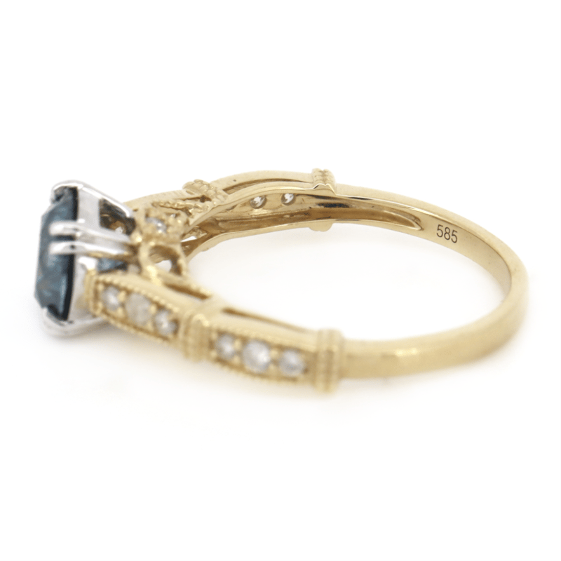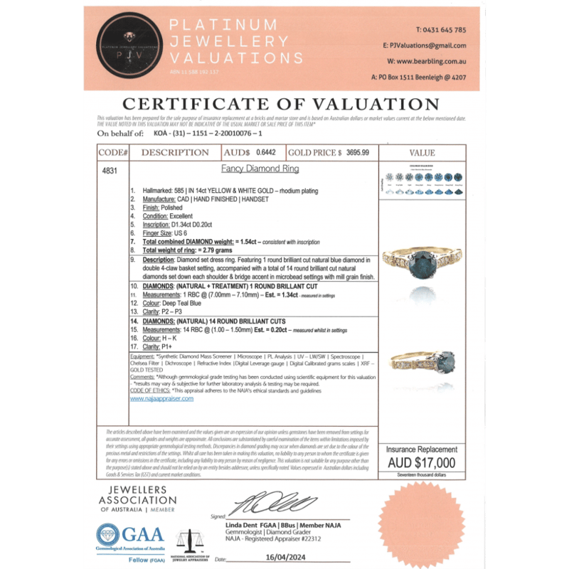 14K YELLOW/WHITE GOLD, BLUE DIAMOND, CLASSIC RING. The Centre Features, One Round Brilliant Cut, Deep Teal Blue, Diamond (1.34Ct, P2-P3 Clarity), 4 Claw Set. Decorating The Band Are, 14 Round Brilliant Cut, Diamonds (0.20Ct Tdw, H-K Colour, P1+ Clarity), Micro-Bead Set With Millegrain Detail. Ring Size L 1/2. Valuations Provided by an Independent Third-Party Professional Not Directly Associated With Lloyds Auctions at AUD $$17,000.00This valuation has been conducted by an independent third-party professional. The valuation amount is an assessment by the issuing valuer and does not reflect the auction value of the item. Any inquiries regarding the valuation should be directed to the issuing valuer (refer to contact details on the certificate), as Lloyds Auctions has no affiliation or influence over the valuation, the valuer, or the stated amount. Condition: Good - Refer Images 0645988+159