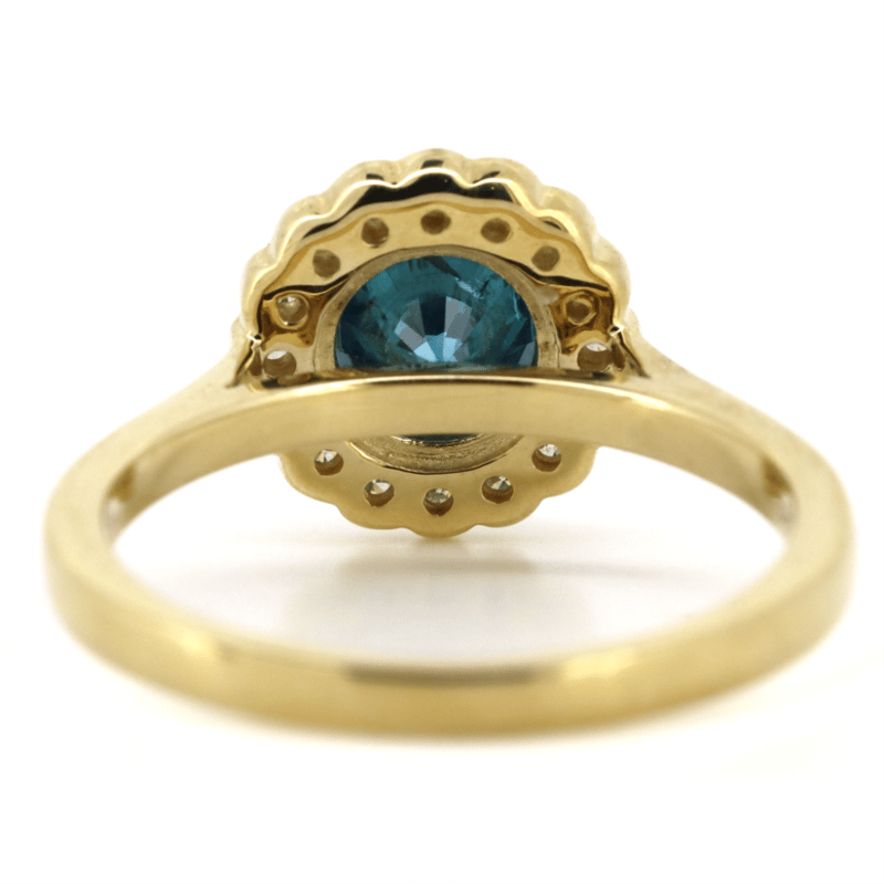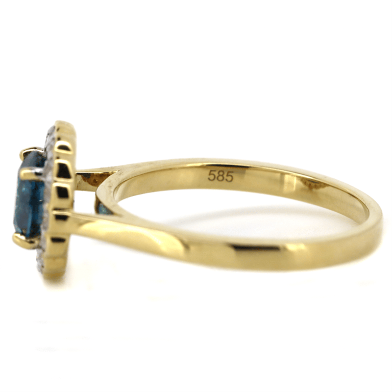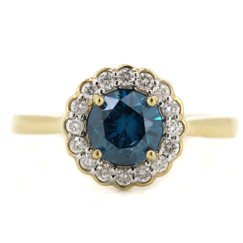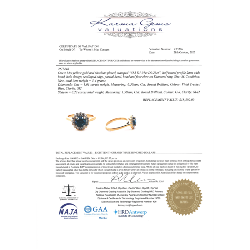 14K YELLOW GOLD, BLUE DIAMOND AND DIAMOND, HALO RING. The Centre Features, One Round Brilliant Cut, Fancy Blue Diamond (1.01Ct, Si2 Clarity), 4 Claw Set. Surrounding The Centre In A Halo Are, 16 Round Brilliant Cut, Diamonds (0.23Ct Tdw, G-J Colour, Si-I2 Clarity), Semi-Bezel/Bead Set. Ring Size M. Valuations Provided by an Independent Third-Party Professional Not Directly Associated With Lloyds Auctions at AUD $$18,300.00This valuation has been conducted by an independent third-party professional. The valuation amount is an assessment by the issuing valuer and does not reflect the auction value of the item. Any inquiries regarding the valuation should be directed to the issuing valuer (refer to contact details on the certificate), as Lloyds Auctions has no affiliation or influence over the valuation, the valuer, or the stated amount. Condition: Good - Refer Images 0645988+160