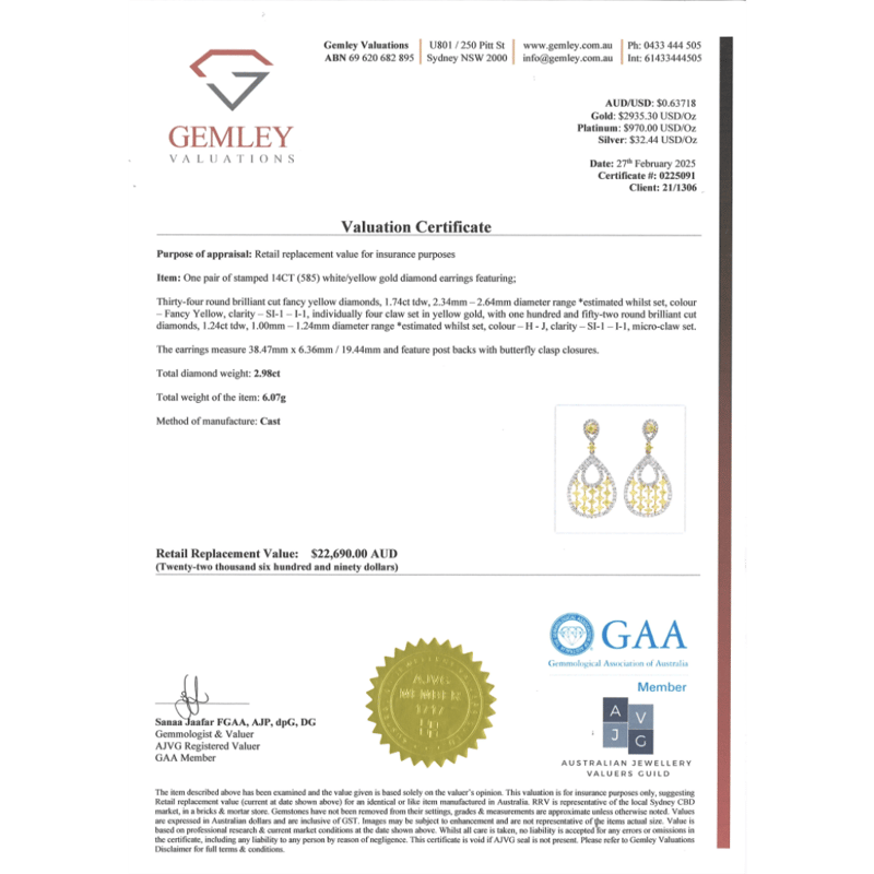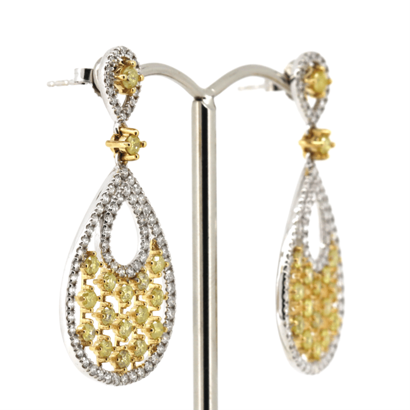 The Earrings Feature, 34 Round Brilliant Cut, Fancy Yellow, Diamonds (1.74Ct Tdw, Si1-I1 Clarity), 4 Claw Set In Yellow Gold. Decorating The Halos Are, 152 Round Brilliant Cut, Diamonds (1.24Ct Tdw, H-J Colour, Si-I1 Clarity), Claw Set. The Earrings Have Post-Backs, With 14K White Gold Butterfly Clasps.