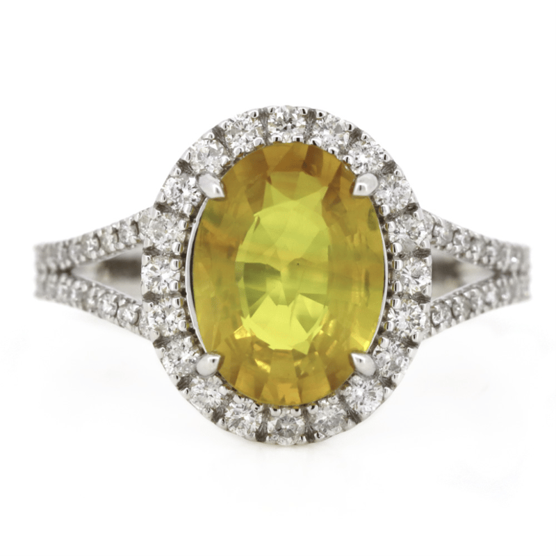 14K WHITE GOLD, YELLOW SAPPHIRE AND DIAMOND, HALO RING. The Centre Features, One Oval Mixed Cut, Medium-Dark Yellow, Sapphire (2.51Ct, Moderate-Heavy Inclusions), 4 Claw Set. Surrounding The Centre In A Halo And Decorating The Split Band Are, 64 Round Brilliant Cut, Diamonds (0.48Ct Tdw, H-J Colour, Si-I2 Clarity), Bead Set. Ring Size M 1/2. Valuations Provided by an Independent Third-Party Professional Not Directly Associated With Lloyds Auctions at AUD $$14,300.00This valuation has been conducted by an independent third-party professional. The valuation amount is an assessment by the issuing valuer and does not reflect the auction value of the item. Any inquiries regarding the valuation should be directed to the issuing valuer (refer to contact details on the certificate), as Lloyds Auctions has no affiliation or influence over the valuation, the valuer, or the stated amount. Condition: Good - Refer Images 0645988+121