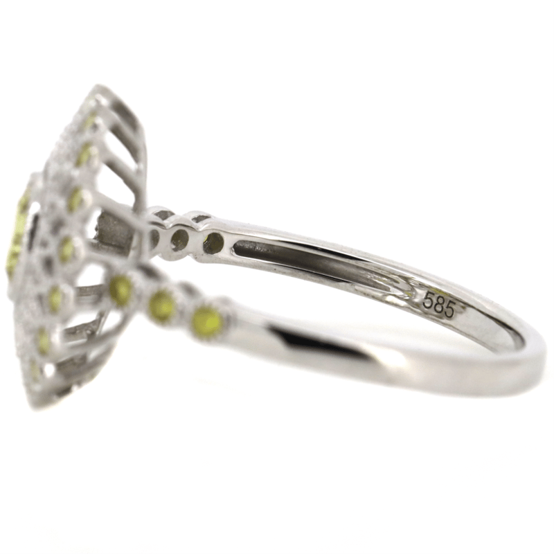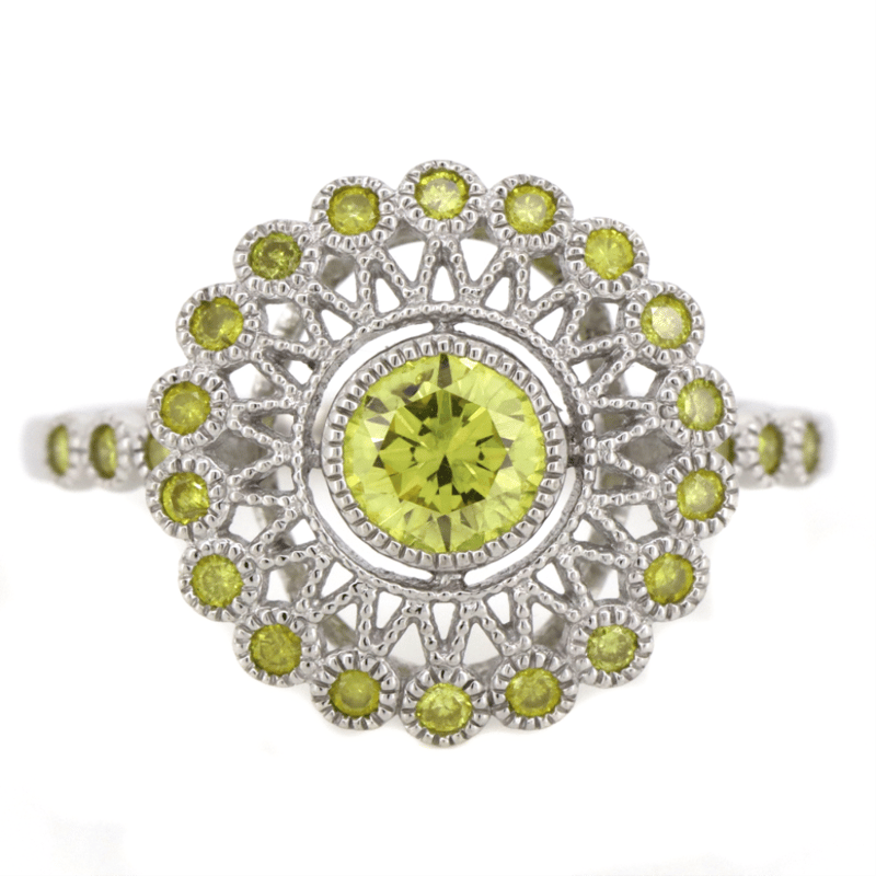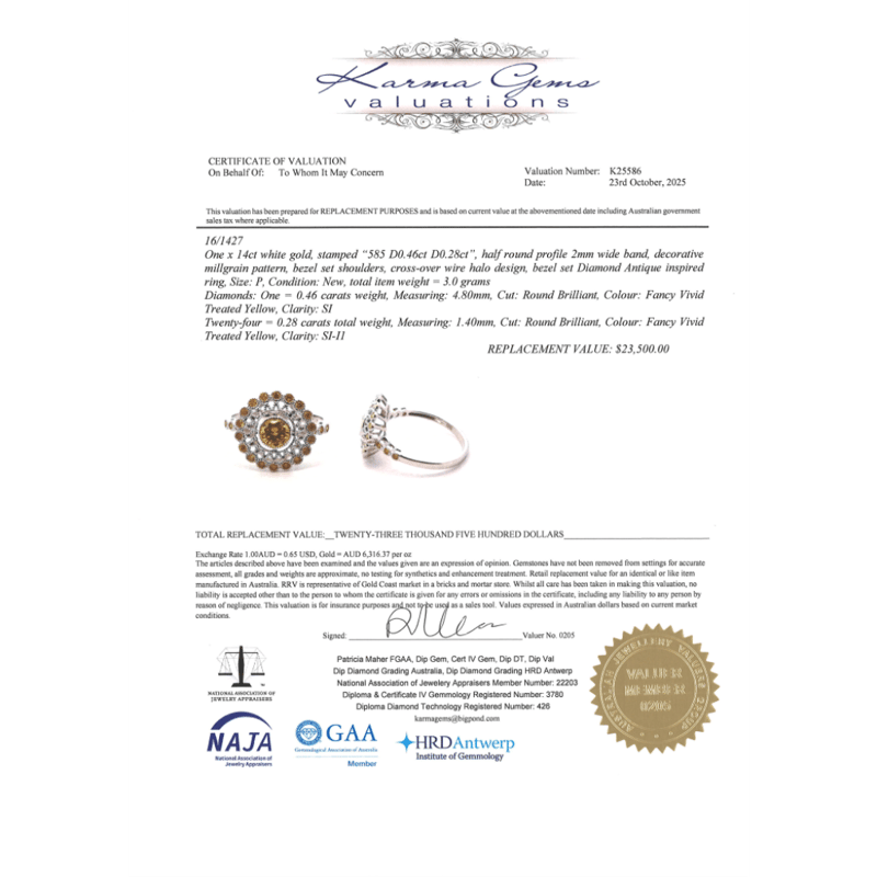 14K WHITE GOLD AND FANCY YELLOW DIAMOND, ANTIQUE INSPIRED RING. The Centre Features, One Old Mine Cut, Yellow Diamond (0.46Ct, Si Clarity, Treated), Bezel Set With Millegrain Detail. Surrounding The Centre In A Halo And Decorating The Band Are, 24 Round Brilliant Cut, Yellow Diamonds (0.29Ct Tdw, Si-I1 Clarity, Treated), Bezel Set With Millegrain Detail. Ring Size P. Valuations Provided by an Independent Third-Party Professional Not Directly Associated With Lloyds Auctions at AUD $$23,500.00This valuation has been conducted by an independent third-party professional. The valuation amount is an assessment by the issuing valuer and does not reflect the auction value of the item. Any inquiries regarding the valuation should be directed to the issuing valuer (refer to contact details on the certificate), as Lloyds Auctions has no affiliation or influence over the valuation, the valuer, or the stated amount. Condition: Good - Refer Images 0645988+156