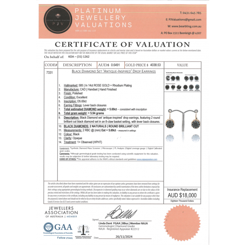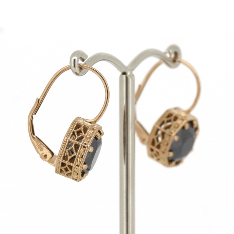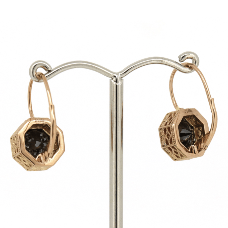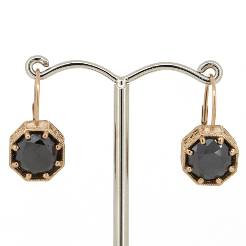 14K ROSE GOLD, BLACK DIAMOND, ANTIQUE INSPIRED DROP EARRINGS.