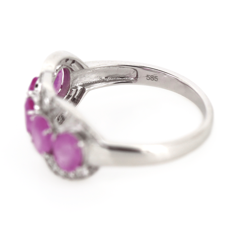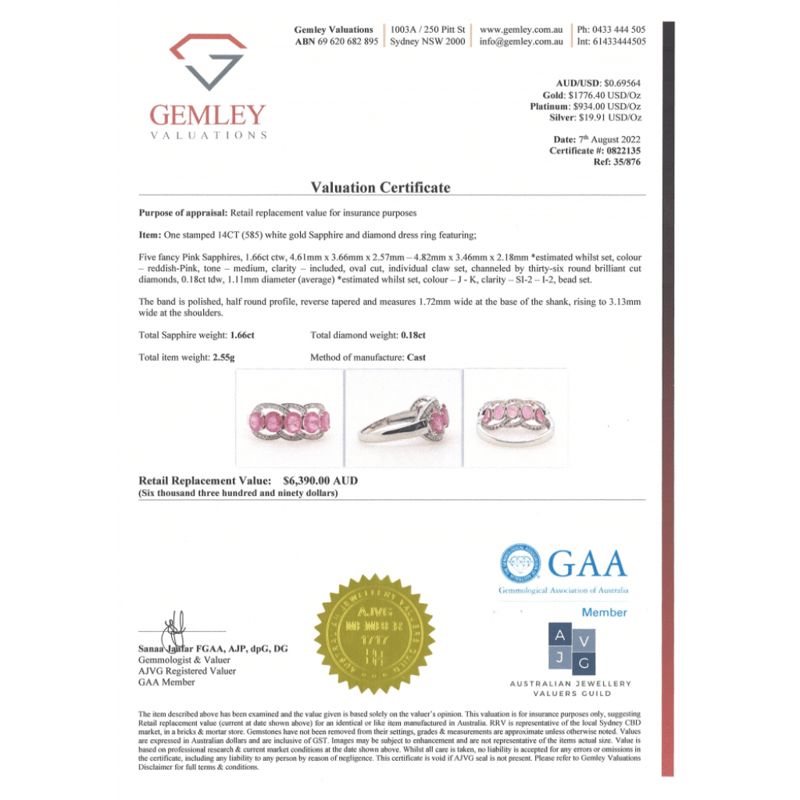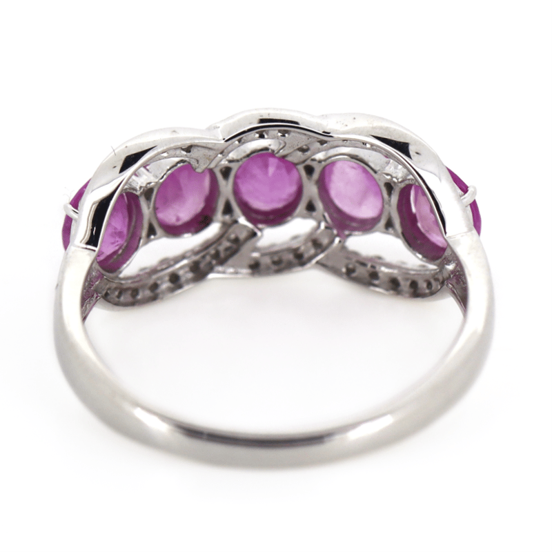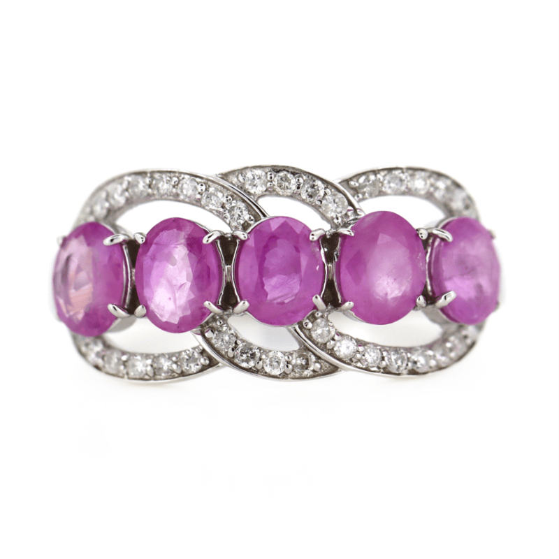 The Design Centrally Features, 5 Oval Cut, Medium Reddish-Pink, Sapphires (1.66Ct Tsw, Included), Claw Set. Decorating The Design Are, 36 Round Brilliant Cut, Diamonds (0.18Ct Tdw, J-K Colour, Si2-I2 Clarity), Bead Set.