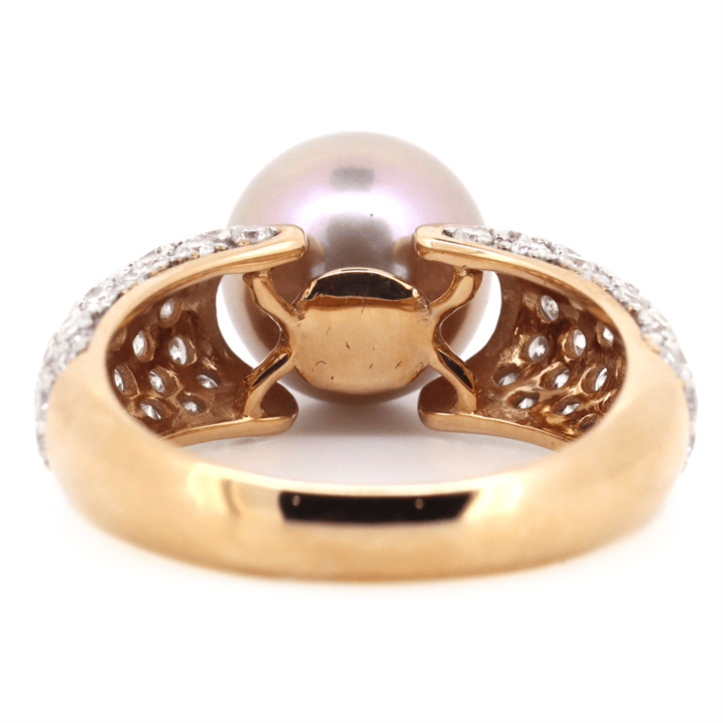 14K ROSE GOLD, PURPLE CULTURED SOUTH SEA PEARL AND DIAMOND, STATEMENT RING. The Centre Features, One Round, Pinkish-Purple, Cultured South Sea Pearl (9.50Mm - 10.00Mm Size). Accompanied By, 84 Round Brilliant Cut, Diamonds (1.34Ct Tdw, H-K Colour, P2-P3 Clarity), Bead Set. Ring Size O. Valuations Provided by an Independent Third-Party Professional Not Directly Associated With Lloyds Auctions at AUD $$10,600.00This valuation has been conducted by an independent third-party professional. The valuation amount is an assessment by the issuing valuer and does not reflect the auction value of the item. Any inquiries regarding the valuation should be directed to the issuing valuer (refer to contact details on the certificate), as Lloyds Auctions has no affiliation or influence over the valuation, the valuer, or the stated amount. Condition: Good - Refer Images 0645988+138
