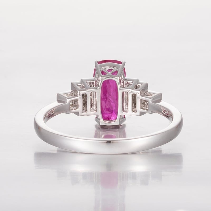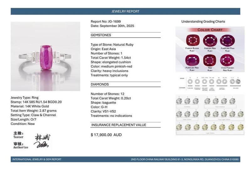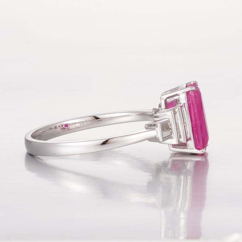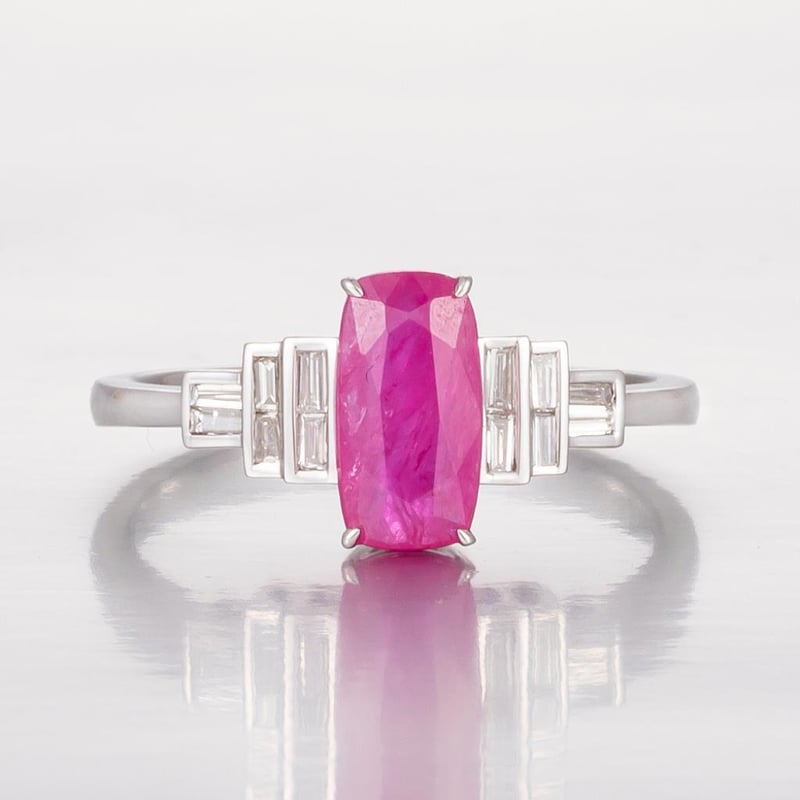 14CT WHITE GOLD RUBY AND DIAMOND ANTIQUE STYLE RING Featuring Centre, One Elongated Cushion Cut, Medium Pinkish-Red Ruby (1.54Ct, Heavy Inclusions), Claw Set, With 12 Baguette Cut Diamonds (0.20Ct Tdw, G-H Colour, Vs1-Vs2 Clarity), Channel Set. Ring Size O. Valuations Provided by an Independent Third-Party Professional Not Directly Associated With Lloyds Auctions at AUD $17900This valuation has been conducted by an independent third-party professional. The valuation amount is an assessment by the issuing valuer and does not reflect the auction value of the item. Any inquiries regarding the valuation should be directed to the issuing valuer (refer to contact details on the certificate), as Lloyds Auctions has no affiliation or influence over the valuation, the valuer, or the stated amount. Condition: Good - Refer Images 0584587+2229